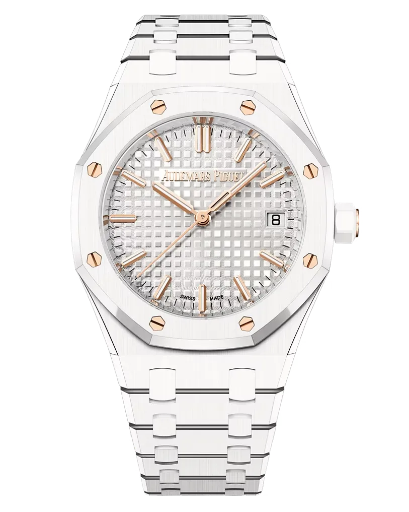 저스틴 비버의 로열 오크를 보라. 그가 손목에 찬 것은 사람들에게 사랑받는 ‘점보’가 아니라, 화이트 세라믹에 로즈 골드 장식이 더해진 작은 버전이다. 점보가 39mm인 반면, 비버의 시계는 고작 34mm로 아주 아담하다.