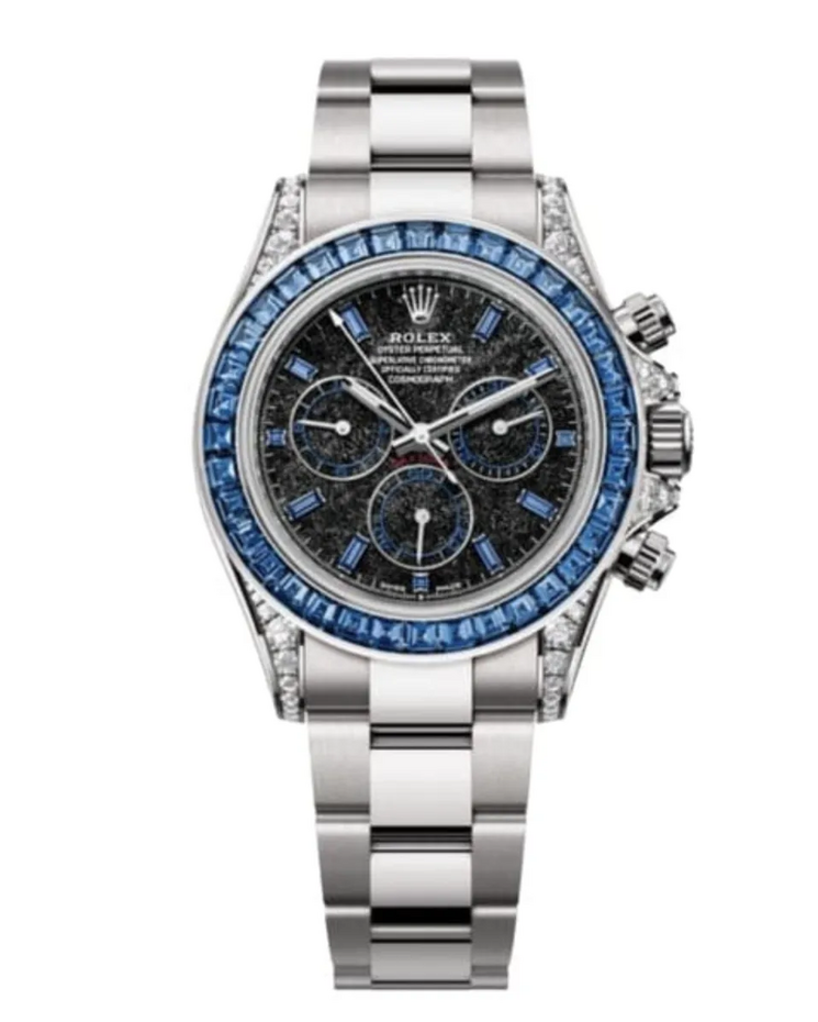 우선 베젤에는 36개의 눈부신 바게트 컷 블루 사파이어가 세팅되어 있다. 이어 케이스 중앙과 러그에는 54개의 브릴리언트 컷 다이아몬드가 장식되어 있다. 다이얼은 놀라운 은색 흑요석으로 제작되었는데, 이는 결정 구조가 형성될 시간도 없이 빠르게 용암이 식으면서 유리 같은 광택을 띠게 된 암석이다. 빛에 따라 회색, 검정, 은색으로 미묘하게 변화하는 것이 특징이다. 이 다이얼 위에는 또다시 바게트 컷 블루 사파이어로 장식된 아워 인덱스가 얹혀 있으며, 크로노그래프 서브 다이얼 안쪽의 블루 타이포그래피와 조화를 이룬다. 내부에는 72시간 파워리저브를 가진 자동 무브먼트 롤렉스 cal. 4131이 탑재되어 있으며, 마무리는 화이트 골드 오이스터 브레이슬릿이다.