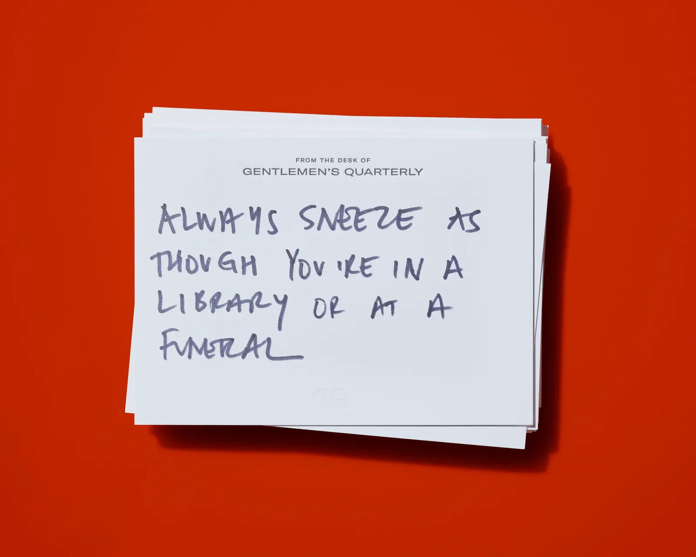 3. 항상 도서관이나 장례식장에 있는 것처럼 조용히 재채기하라. 코와 입은 팔꿈치 안쪽에 댄다. 마치 래퍼의 ‘댑’ 동작처럼.