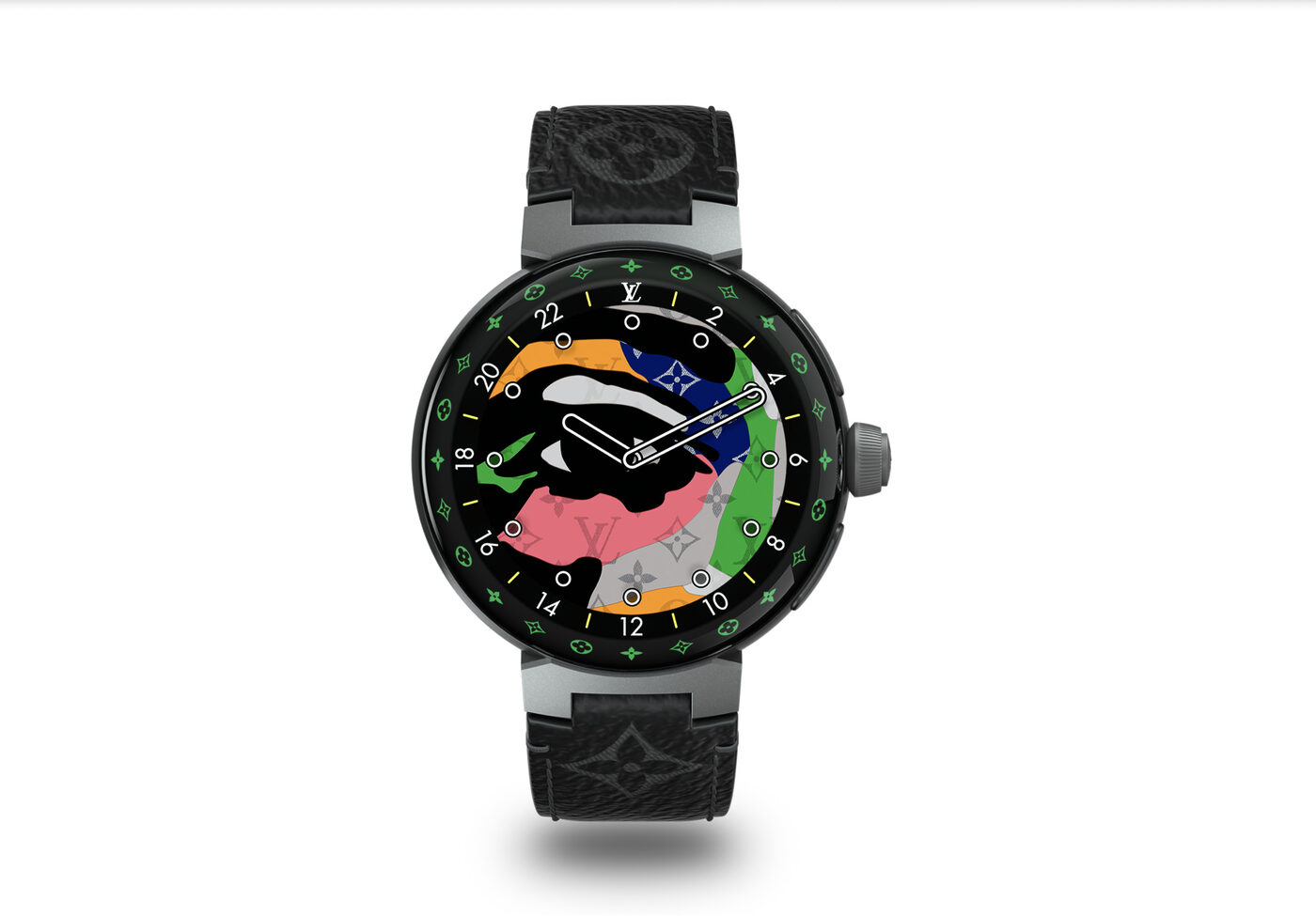 루이 비통 특유의 라운드 케이스 ‘땅부르’에 루이 비통이 설계한 운영 체제가 탑재된 ‘땅부르 호라이즌 라이트 업 커넥티드 워치’. 24개의 LED 조명이 장식된 사파이어 글라스가 특징이다. 풀 라운드 아몰레드 터치스크린과 스냅드래곤 웨어 4100 프로세서를 기반으로 여행 계획 및 보딩 관련 정보·알리페이·심박수·달력·만보기·날씨 알림 등 기능을 제공한다. 532만원.
