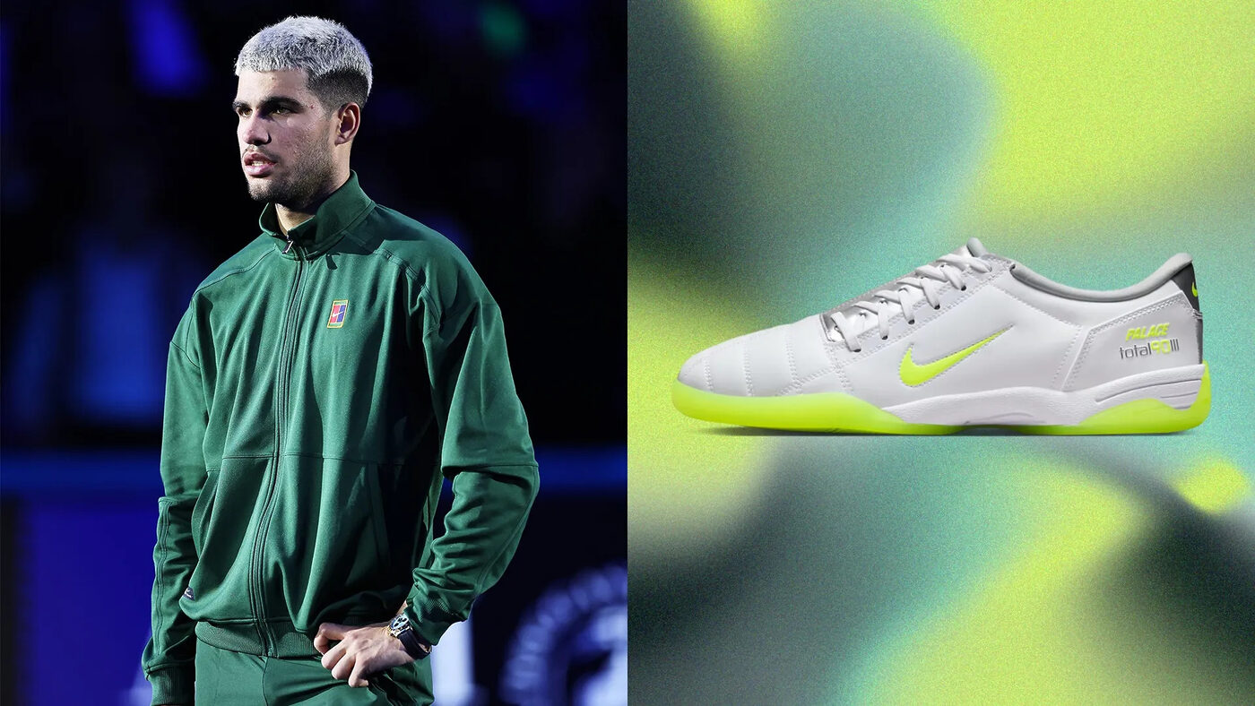 어제 니토 ATP 파이널에서 테일러 프리츠를 꺾은 뒤, 세계 챔피언 알카라스는 테니스 유니폼 대신 그린 컬러의 나이키코트 헤리티지 재킷과 매치되는 쇼츠, 그리고 희귀템인 팔라스 × 나이키 토탈 90 III를 착용했다. 지난달 말 ‘P90 컬렉션’의 일부로 발매된 이 신발은 출시와 동시에 순식간에 완판됐다.