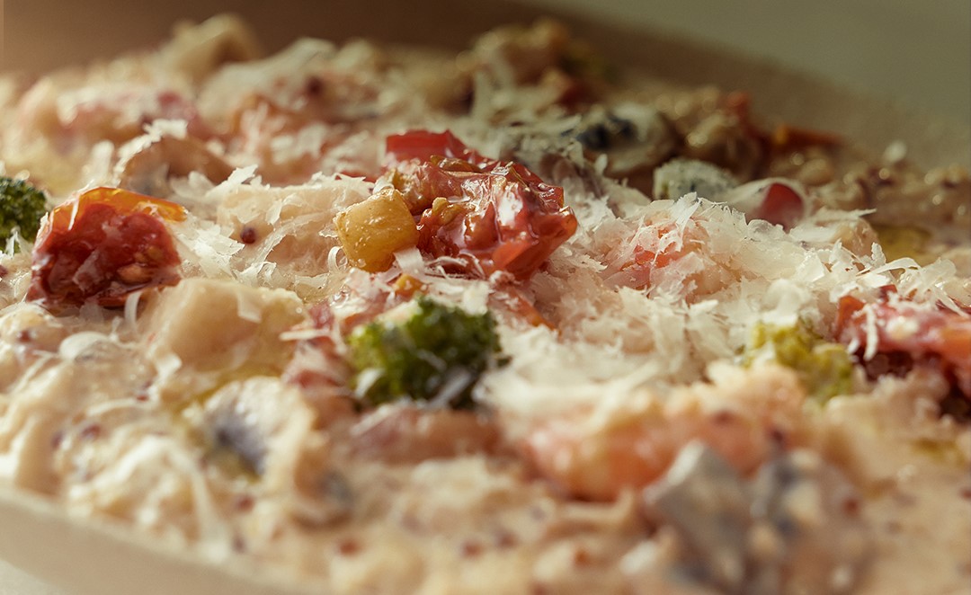 깍두기와 썬드라이 토마토, 퀴노아가 어우러진 이색 리조또. ‘깍두기/동치미 모드’로 5일간 깍두기를 숙성하면, 발효의 감칠맛이 극대화된다. 작게 자른 깍두기를 볶은 뒤, 새우와 버섯을 넣고 리조또 베이스를 만드는데, 쌀 대신에 퀴노아를 사용하는 것이 팁이다. “퀴노아도 김치플러스의 곡류 모드로 보관하면 식감이 정말 좋아요.”