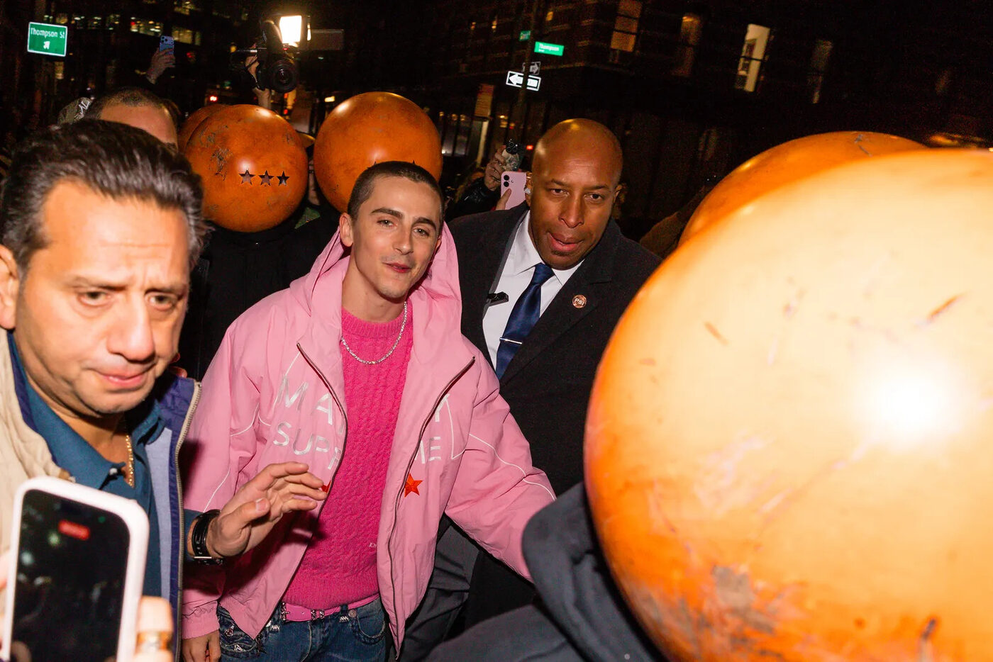 저녁 7시쯤, 수백 명이 티모시 샬라메를 보기 위해 몰려들었다. 그는 검은 SUV에서 내리더니 군중 속으로 뛰어들었다. 사진가들과 셀피족들 사이에서 그의 모습은 아슬아슬하게 보였다. 그리고 나타난 그의 옷은당연히 이번 영화의 굿즈인 바람막이였다. 하지만 전혀 본 적 없는 베이비 핑크 색상이었다.