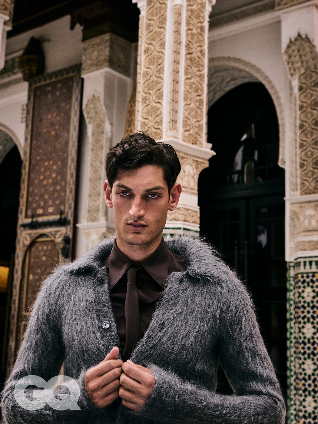 그레이 앙고라 카디건, 초콜릿 브라운 셔츠와 타이, 모두 구찌.