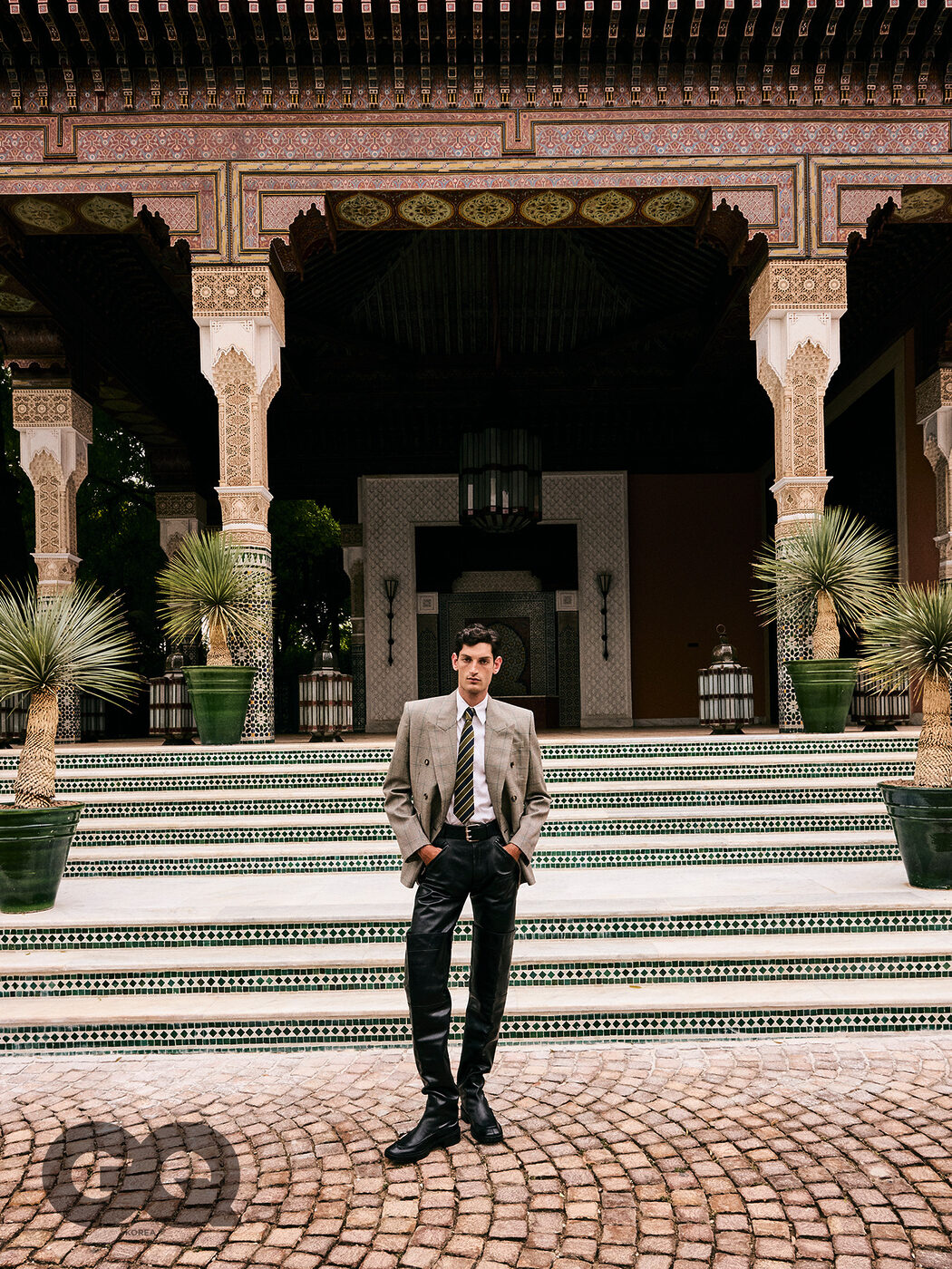 프린스 오브 웨일즈 울 재킷, 셔츠, 가죽 팬츠, 오버 니 부츠, 스트라이프 타이, 벨트, 모두 생 로랑 by 안토니 바카렐로.
