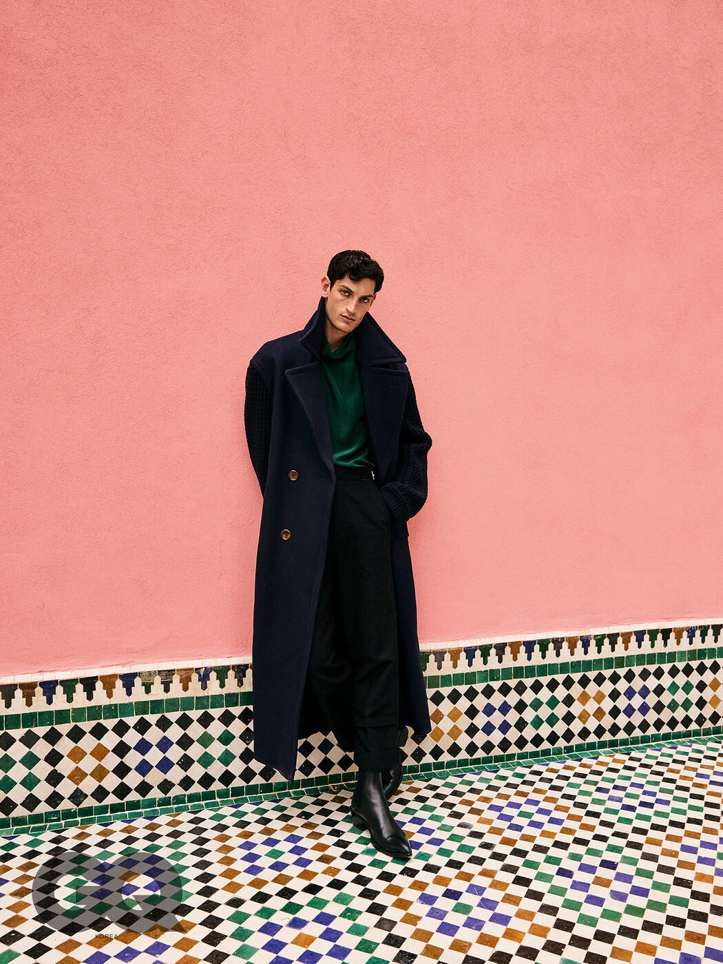 울 더블 코트, 와이드 팬츠, 앵클부츠, 모두 조르지오 아르마니.