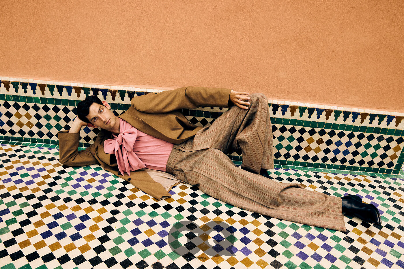 캐멀 재킷, 보 디테일 셔츠, 스트라이프 팔라초 팬츠, 블랙 앵클부츠, 모두 드리스 반 노튼.