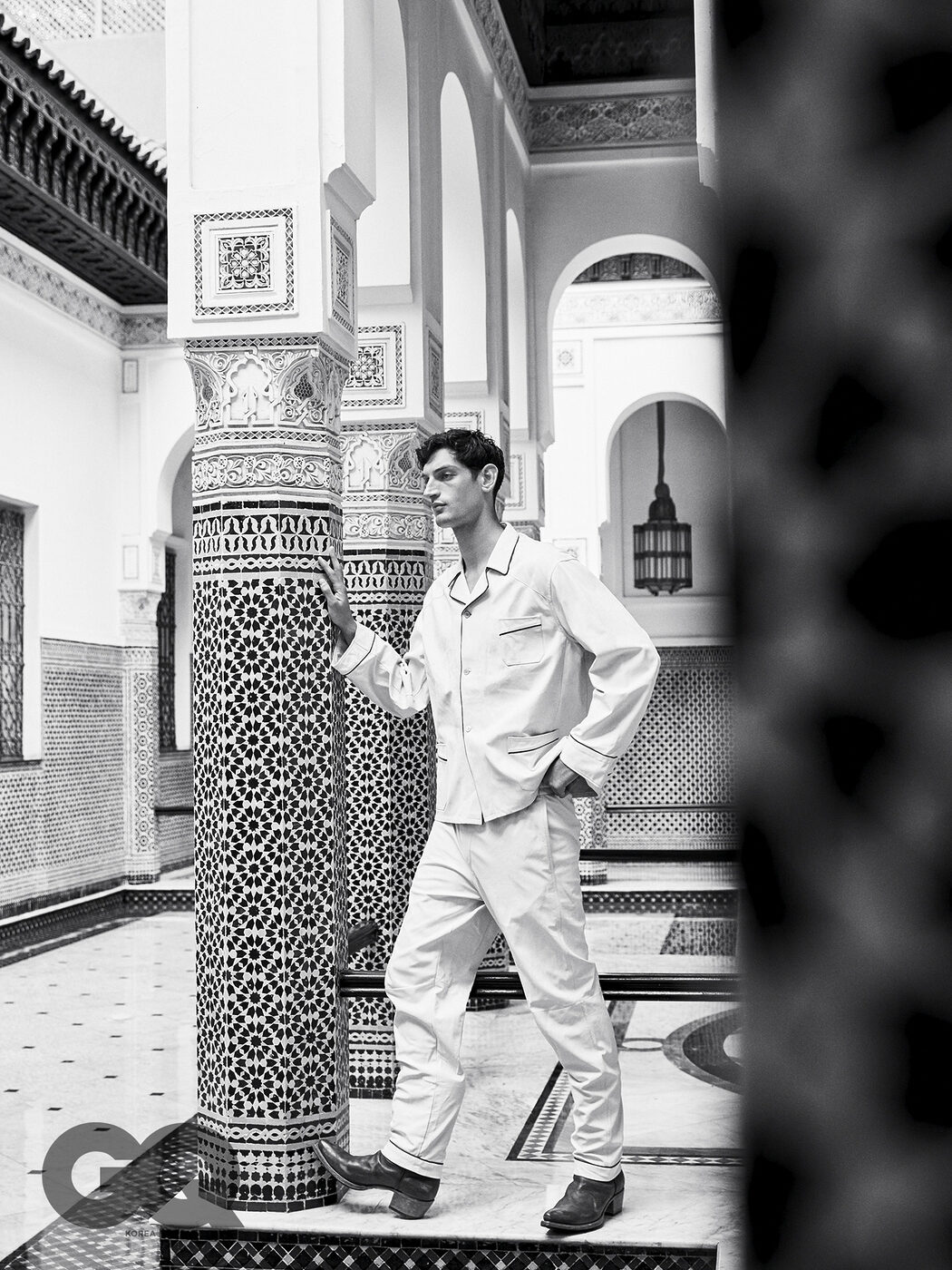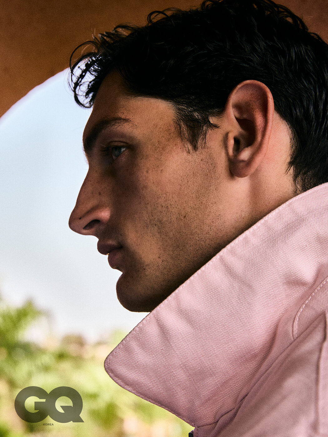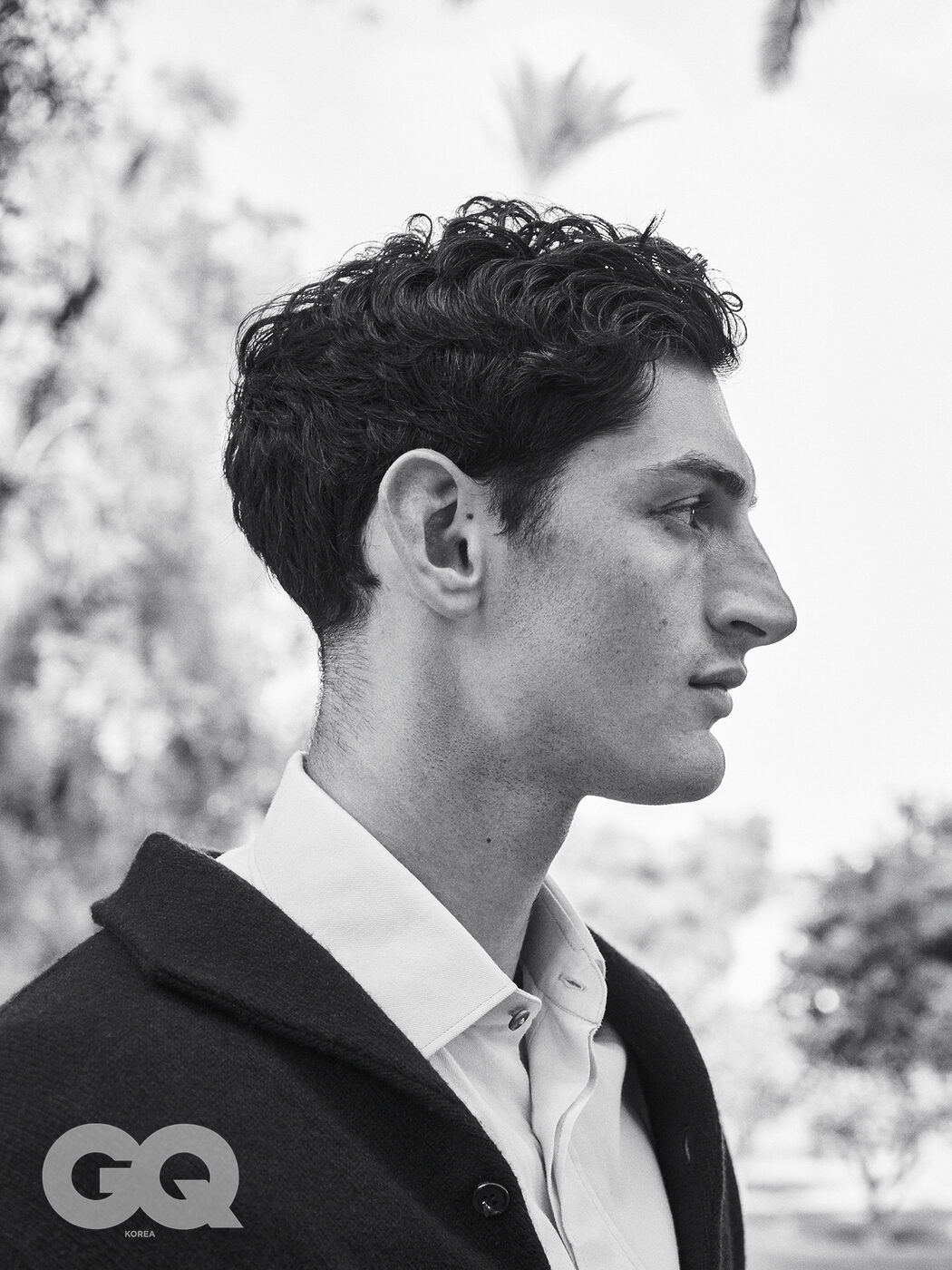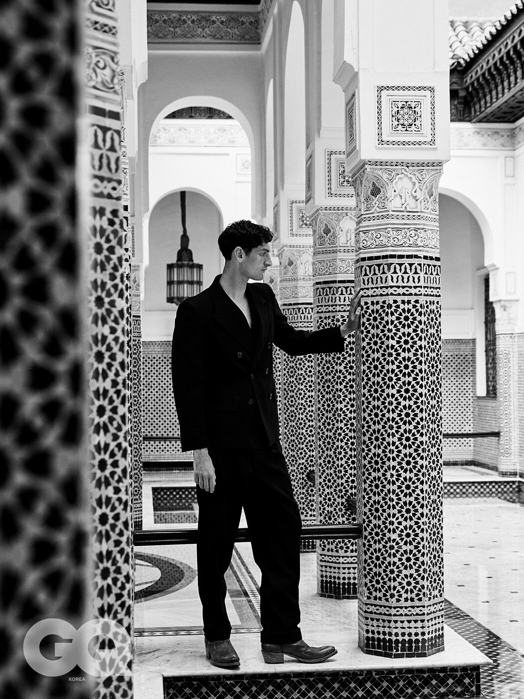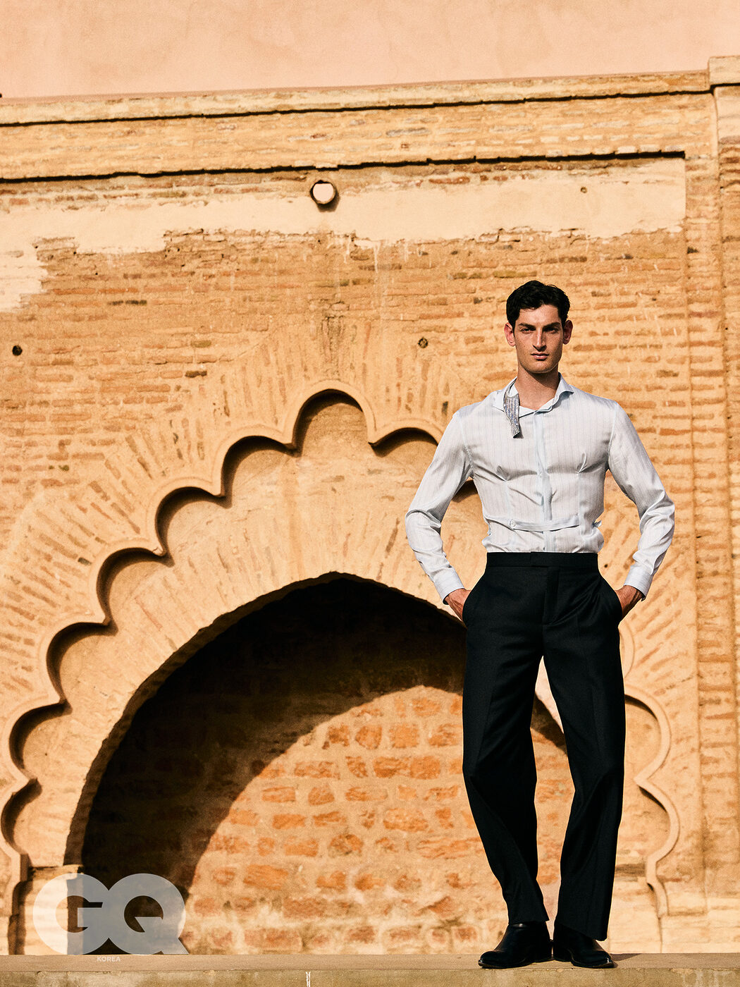 칼라 장식 스트라이프 실크 셔츠, 모헤어 팬츠, 블랙 부츠, 모두 디올 맨.
