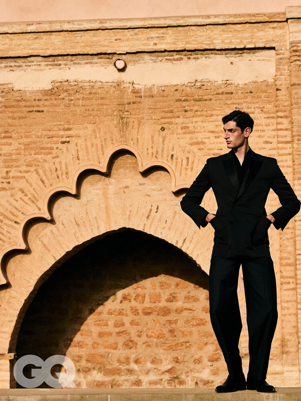 실크 쿠튀르 수트, 블랙 카디건, 블랙 부츠, 모두 디올 맨.