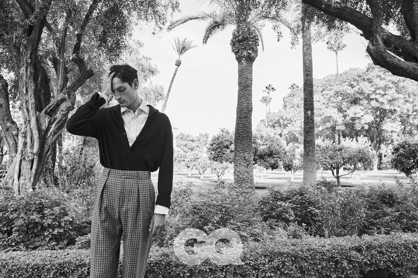 카디건, 셔츠, 하운드 투스 울 팬츠, 모두 제냐.
