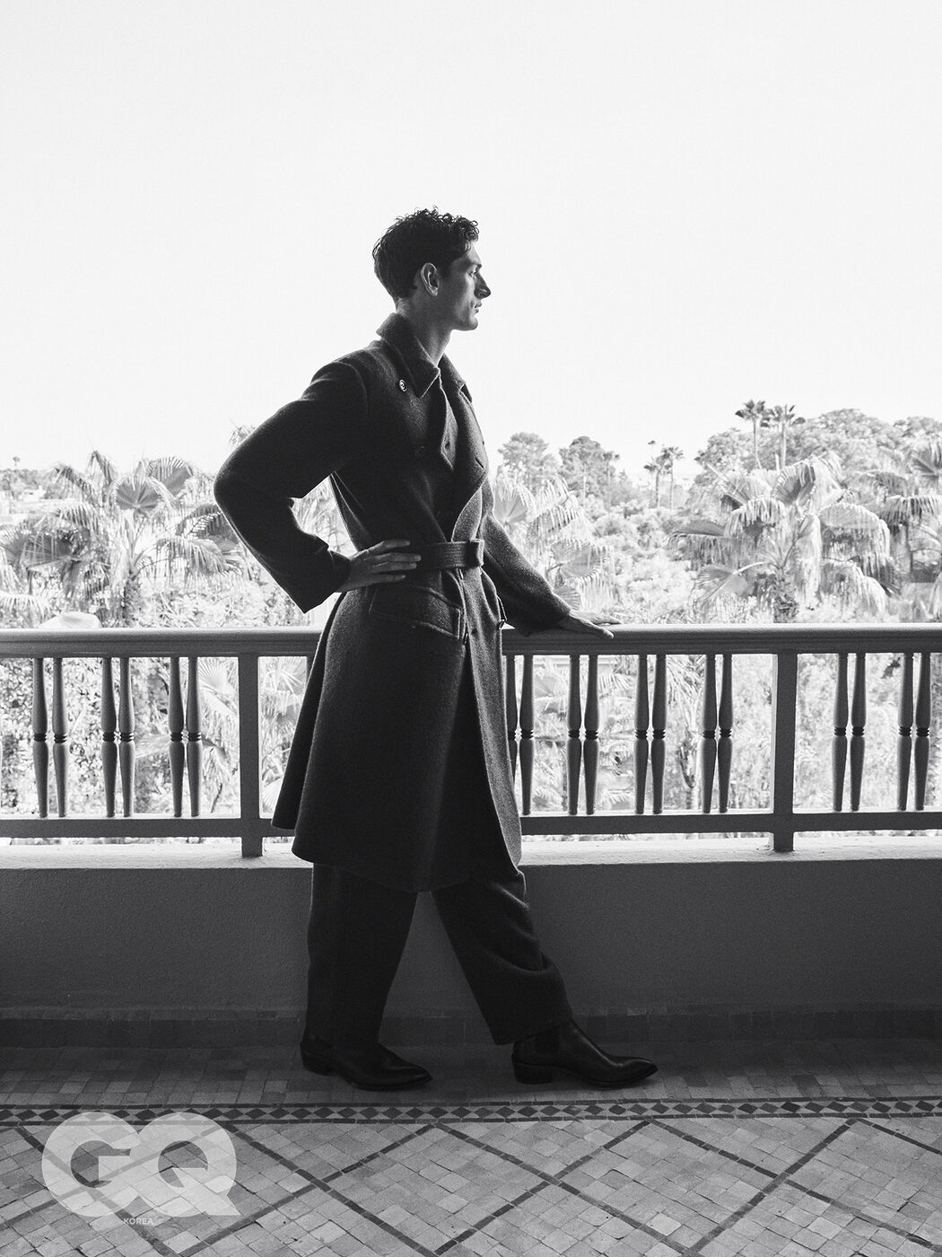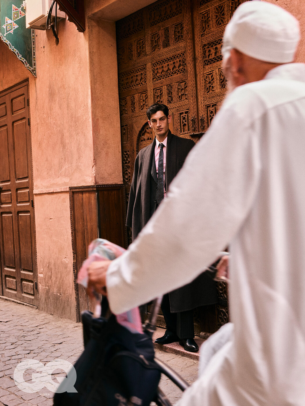 더스터 코트, 블랙 수트, 핑크 셔츠, 도트 타이, 블랙 앵클부츠, 모두 톰 포드.