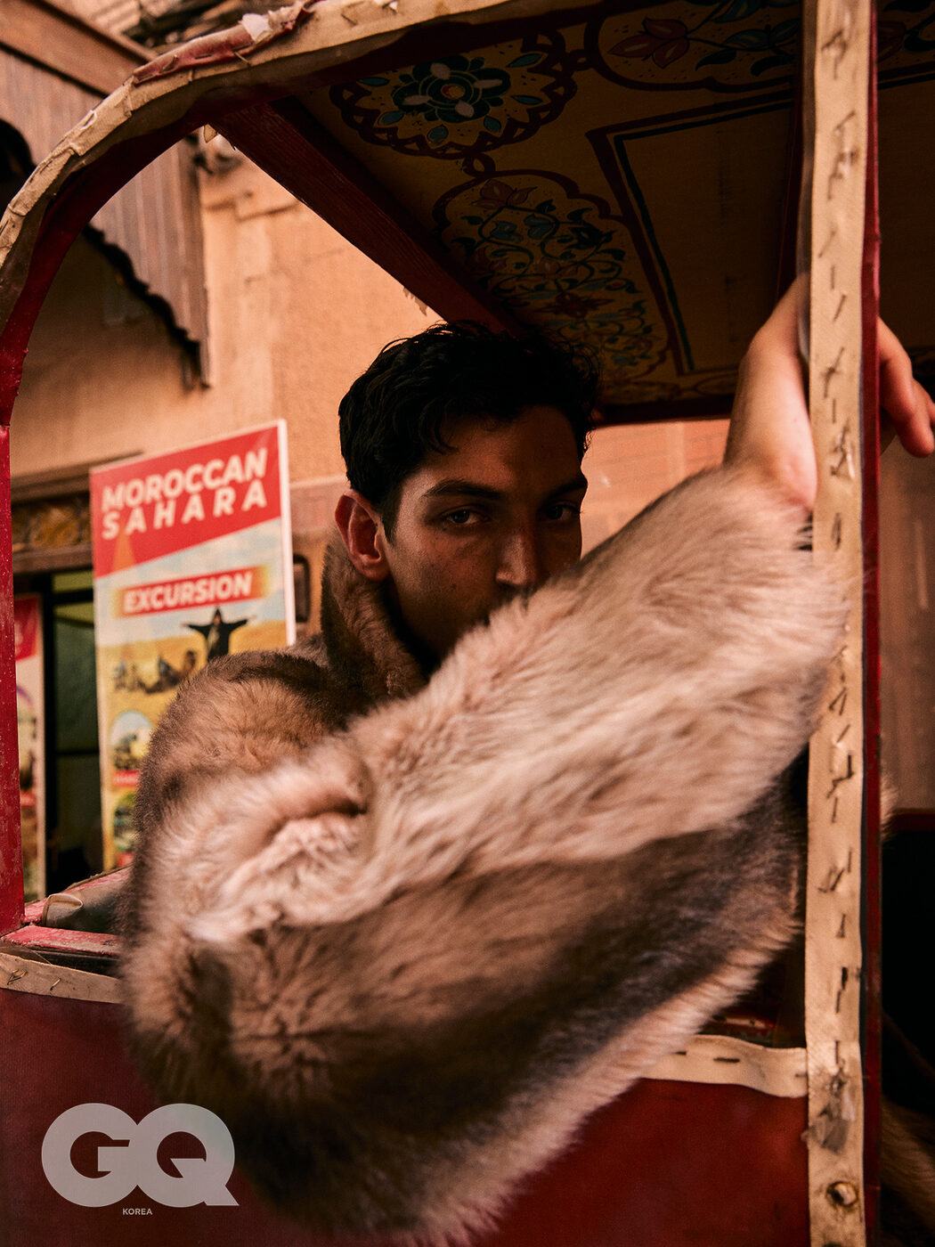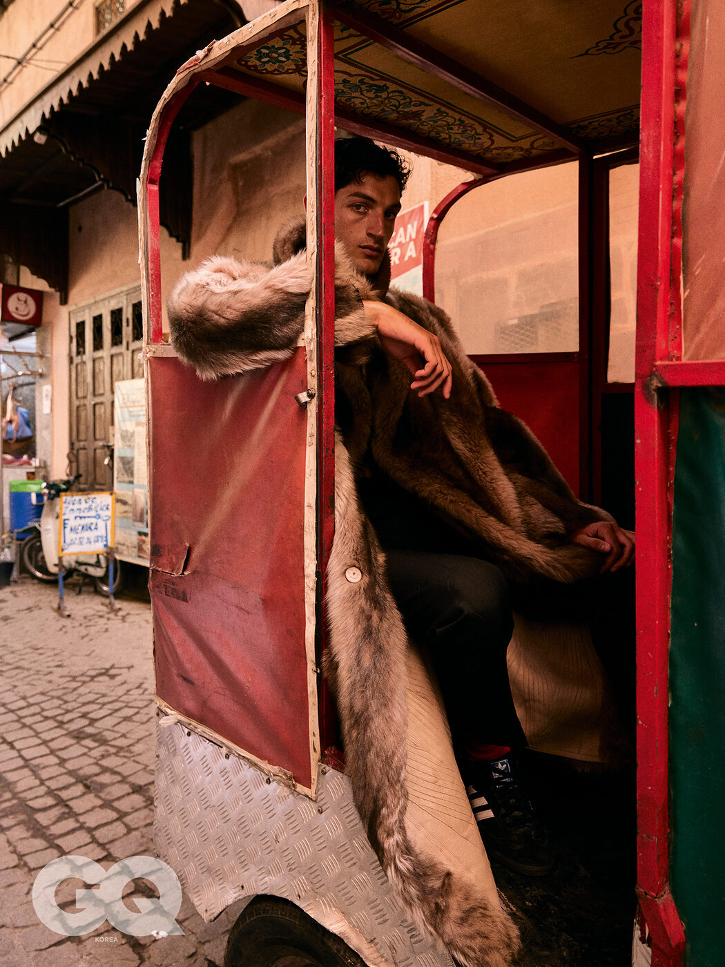 퍼 코트, 팬츠, 모두 펜디. 가젤 스니커즈, 아디다스 오리지널스.