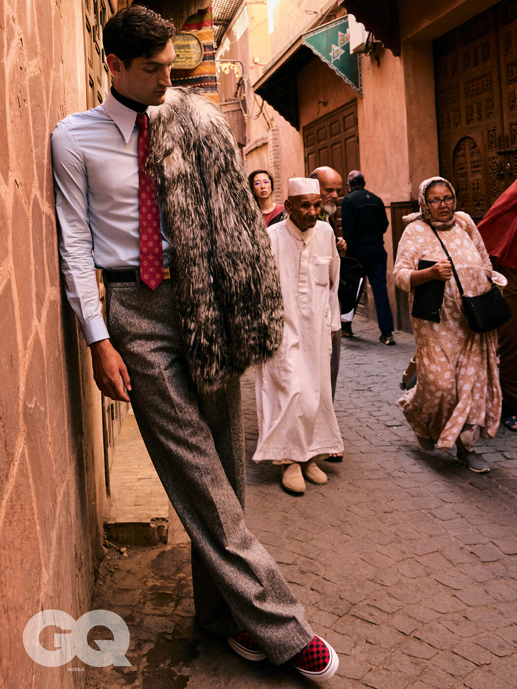 퍼 코트, 스카이 블루 셔츠, 블랙 터틀넥, 울 플레어 팬츠, 모두 발렌티노. 넥타이, 벨트, 레드 앤 블랙 체커 반스 어센틱, 모두 발렌티노 가라바니.