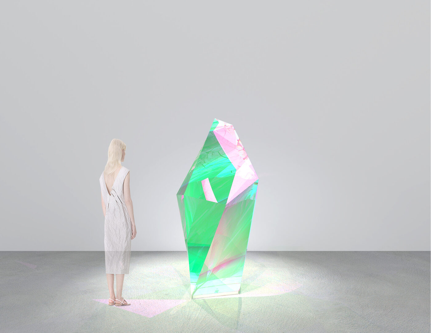 이번 전시엔 세명의 현대 미술 작가가 참여해, 주관적인 시선으로 불가리의 미학적 세계관을 사유한 설치미술 작품들을 선보인다. 모두 ‘색의 움직임’이라는 공통 주제를 담았다. ‘색채의 과학’ 챕터가 마무리될 지점, 불현듯 형형색색의 자동 세차장 같은 방이 등장한다. 거대한 브러시들이 투박한 소리를 내며 역동적으로 회전하고 있다. 자동차 세차 브러시의 회전 구조를 예술적 오브제로 전환한 라라 파바레토 Lara Favaretto의 설치작품 ‘레벨 파이브 Level Five’다. 부드럽고 조각적인 형태로 탈바꿈한 다채로운 색상의 브러시들은 순간적으로 합쳐졌다가 흩어지고, 멈췄다가 다시 돌기를 반복한다. 움직임과 리듬, 색 에너지의 3중주가 펼쳐지며 시각적 명상을 통해 기계와 유기체 사이의 경계를 탐색하는 작품. ‘색채의 상징성’ 챕터엔 모리 마리코 Mori Mariko의 ‘오노고로의 스톤 III Onogoro Stone III’가 자리했다. 새하얀 공간 한가운데 성인 키 높이의 크고 투명한 돌 하나가 놓여 있고, 금속성 표면에 반사된 빛은 고정되지 않은 색감을 띠며 관람객의 위치와 조명에 따라 끊임없이 변화한다. 고대 일본 신화에서 기원을 찾은 서사를 현대적 조형 언어로 옮긴 작품. 미래적인 소재와 영적 미니멀리즘을 결합해 ‘기원’이라는 개념을 하나의 조형물로 압축해 시각화했다. 전시의 마지막을 장식한 작품은 나카야마 아키코 Nakayama Akiko의 ‘에코 Echo’. 어두운 공간 중앙에 놓인 카메라, 벽면을 가득 채운 다채로운 색의 투사 이미지, 그리고 물거품이 터지는 영롱한 소리가 맞물려 몽환적인 분위기를 만든다. 나카야마의 작품은 물, 안료, 소리가 실시간으로 결합하며 형태가 끊임없이 바뀌는 ‘살아 있는 회화’에 가깝다. 미세한 진동은 미네랄 안료에 잔파동을 일으키고, 그 표면에서 생성된 색의 패턴은 끊임없이 변화한다. 보석처럼 보이는 색의 물방울들은 불규칙하게 생겨나다가 터진다. 카메라는 이 장면을 광학 줌으로 포착해 거대한 이미지로 벽면에 투사한다. 유동적이고 반짝이는 찰나의 순간들이 화면 위에서 끊임없이 재구성된다.