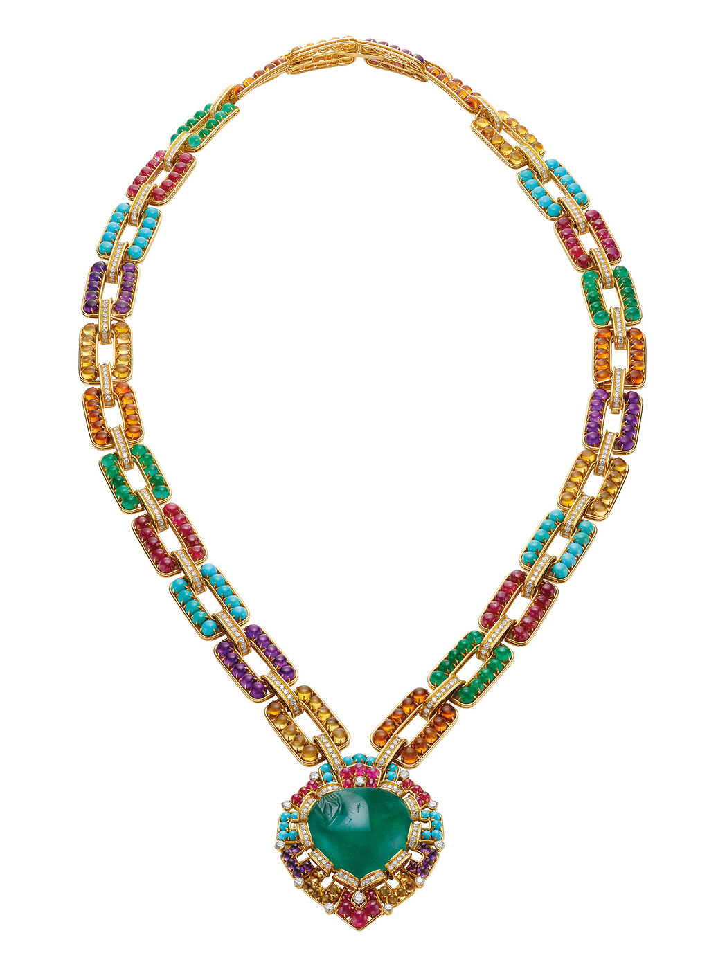 오랜 세월 동안 불가리는 형형색색의 젬스톤을 대담하게 다루며 창의적이고 다채로운 세계관을 구축해왔다. 창립자 소티리오 불가리 Sotirio Bulgari의 초기 작품에서도 이미 색에 대한 탐구가 엿보였다. 하지만 1900년대 초만 해도 하이 주얼리는 플래티넘과 단색 위주의 보수적 디자인을 따르는 것이 일반적이었다. 그러다 제2차 세계 대전 이후 이탈리아에는 색채 혁명의 바람이 불기 시작했고, 불가리는 누구보다 빠르게 그 변화를 포착했다. 1950년대, 불가리는 옐로 골드에 사파이어, 루비, 에메랄드와 다이아몬드를 조합한 대담한 디자인을 선보이며 컬러 주얼리의 새로운 장을 열었다. 이전까지 준보석으로 여겼던 아메시스트, 시트린, 튀르쿠아즈 등의 생동감 넘치는 색감을 과감하게 사용하고, 브랜드 시그니처인 카보숑컷을 더해 색의 깊이와 밀도를 극대화했다. 큼직한 컬러 스톤을 주얼리의 중심에 배치하는 방식은 당시 상당히 급진적인 일이었다. 이런 과감한 시도들은 불가리를 ‘컬러 잼스톤의 대가’로 자리 잡게 했다.