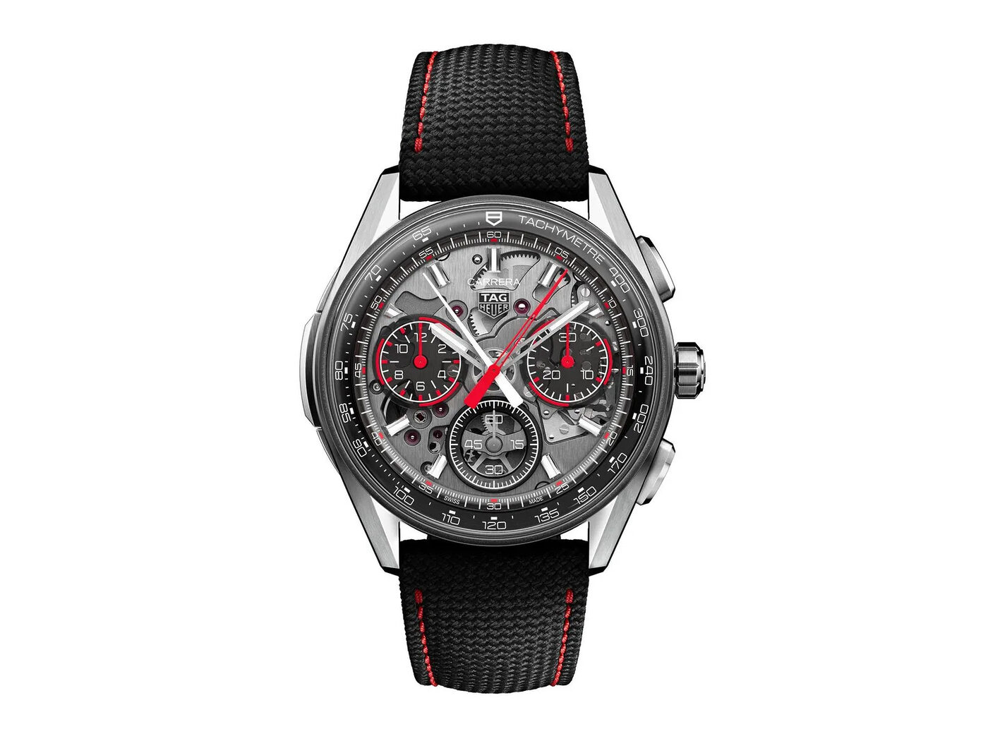 최근 몇 년간 태그 호이어는 두 개의 중앙 초침을 사용해 두 개의 이벤트를 동시에 측정할 수 있는 스플릿 세컨즈 모나코 크로노그래프로 워치메이킹 역량을 과시해왔다. 올해는 이 정교한 시스템을 브랜드의 핵심 컬렉션인 카레라 크로노그래프로 옮겨왔다. 브러시드와 폴리시드 마감이 혼합된 42mm 그레이드 5 티타늄 케이스로 제작됐으며, 연기가 낀 듯한 반투명 다이얼을 통해 내부에서 작동하는 TH81-00 무브먼트를 감상할 수 있다. 레이싱에서 영감을 받은 컬러 포인트도 풍부하다. 대시보드 계기판을 연상시키는 레드 포인트의 크로노그래프 카운터와, 같은 색상 스티칭이 들어간 블랙 러버 스트랩이 조화를 이룬다. 이런 초고난도 컴플리케이션이 저렴할 리는 없지만, GT3 RS를 몰고 트랙을 질주할 때 손목 위에서 보여줄 존재감만큼은 확실하다.