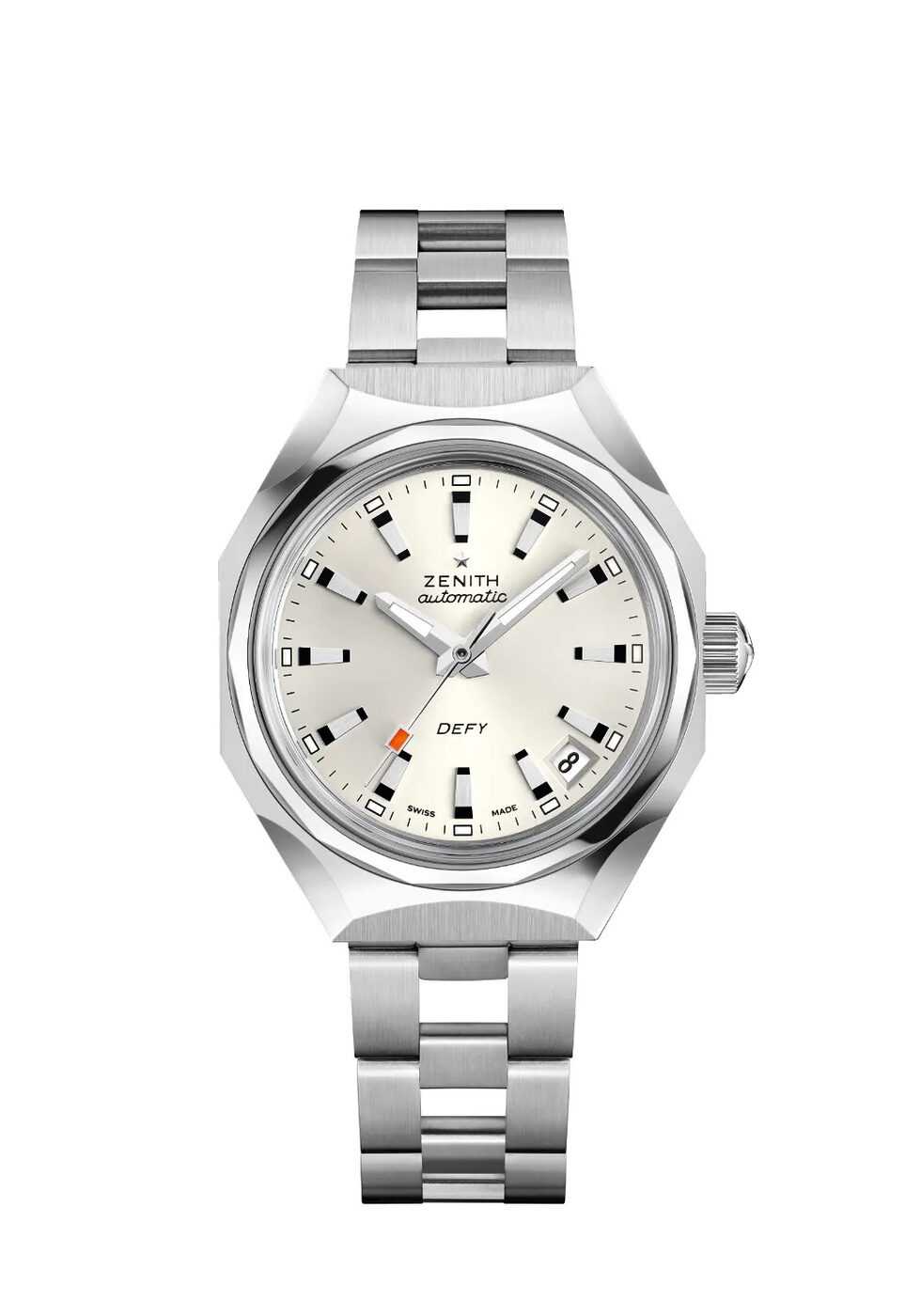 제니스의 신작 중 가장 비싸거나, 가장 복잡하거나, 가장 화려한 모델은 아니다. 그 타이틀은 아마도 로즈 골드 스카이라인 투르비용 스켈레톤이 차지할 테니까. 하지만 데피 리바이벌 A3643는 설명하기는 어렵지만 한눈에 느껴지는 ‘쿨함’을 지녔다. 독특한 옥타곤 케이스와 14각 베젤, 혹은 제니스의 시그니처인 래더 브레이슬릿이 시선을 사로잡는 이유일 수도 있다. 여기에 실버 다이얼, 입체 인덱스, 4시 30분 방향의 날짜창이 더해지며 완성도를 높인다. 이 시계는 1970년대의 감성을 진하게 품고 있으면서도, 2020년대 고급 인디펜던트 워치 디자인의 기묘한 흐름과도 자연스럽게 어우러진다. 더 화려한 다이얼 컬러 옵션도 있지만, 데일리로 착용하기에는 실버 다이얼이 가장 균형 잡힌 선택이라 할 만하다.