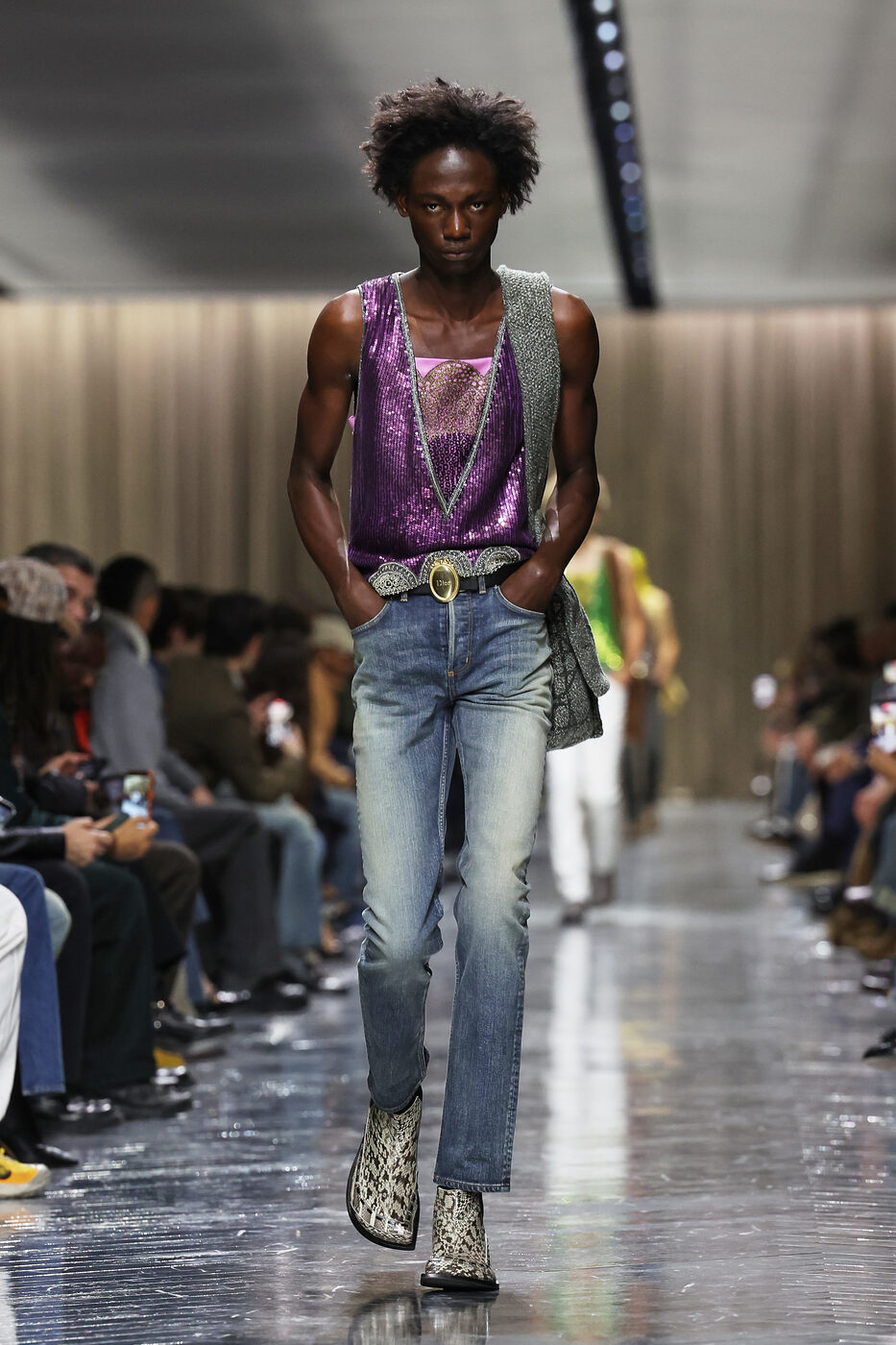 지큐 인스타그램에 올라온 그의 사진 아래 달린 한 댓글이 핵심을 정확히 짚었다. “청바지에 외출용 톱.” 여성복에서 흔히 볼 수 있는 공식이다. 밤에 뭘 입어야 할지 고민될 때, 몸에 잘 맞는 청바지에 약간 화려한 톱을 더하면 끝나는, 검증된 스타일 조합. 실제로 높은 확률로 성공하는 공식이다. 앤더슨이 지난 1월 디올 옴므 런웨이에서 시퀸 탱크톱을 처음 선보였을 때도, 남성들이 이 공식을 따라 하기 시작할 것이라는 예상이 있었다.