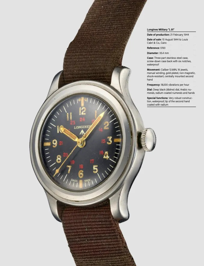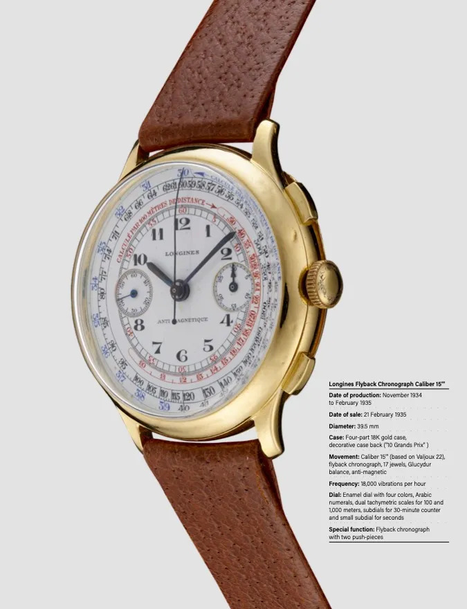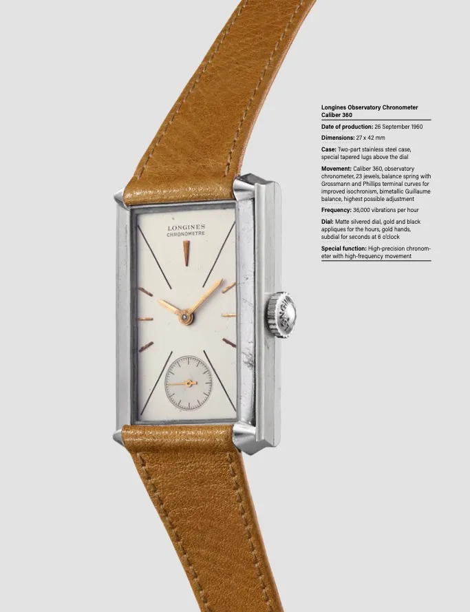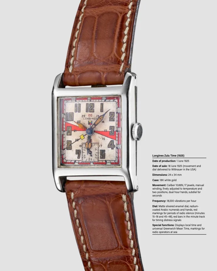 론진은 GMT 시계를 최초로 만든 브랜드 중 하나다. 두 번째 시침을 통해 그리니치 표준시를 표시할 수 있었고, 항해사와 파일럿을 위한 도구로 개발됐다. 다이얼의 빨간 삼각형과 바는 긴급 무선 신호와 관련된 기능적 표시였다.