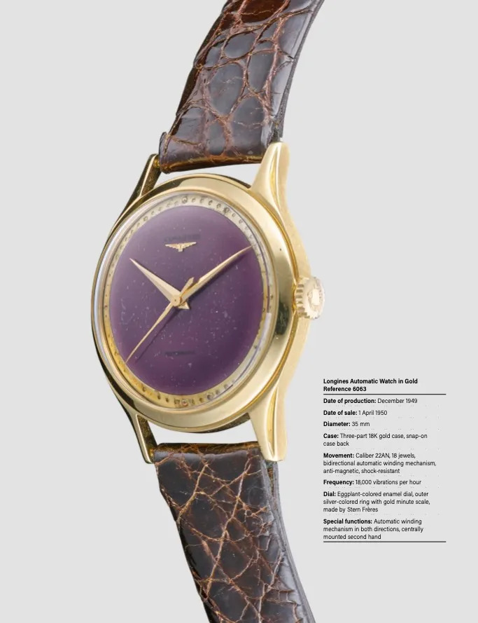 파텍필립을 소유한 스턴 가문과 협업해 제작된 시계로, 에나멜 다이얼 기술이 돋보인다. 론진의 초기 자동 무브먼트도 탑재됐다.