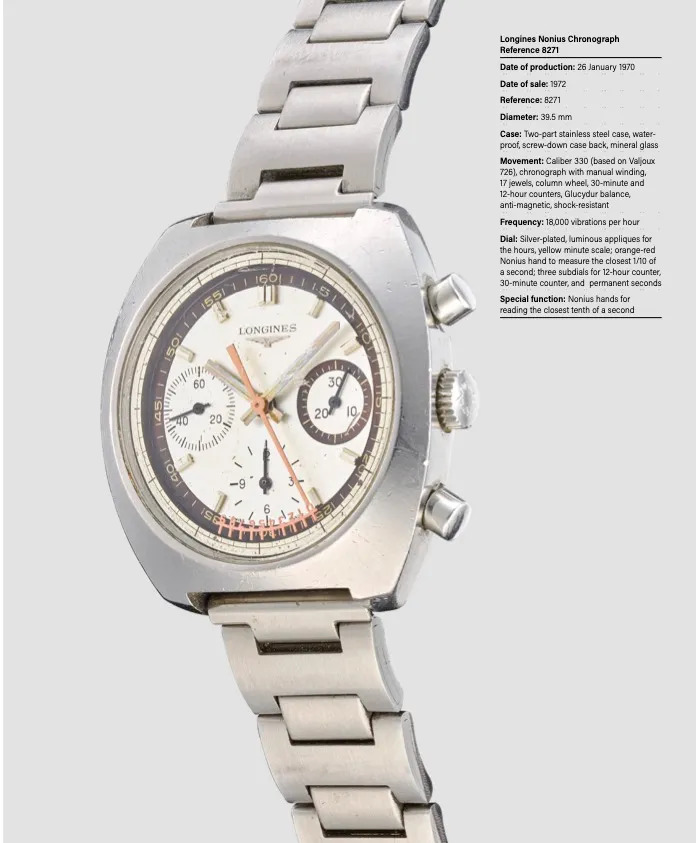 초 단위 측정을 더 정밀하게 읽을 수 있도록 설계된 독특한 오렌지 핸드가 특징이다. 1970년대 크로노그래프 중에서도 수집 가치가 높은 모델이다.