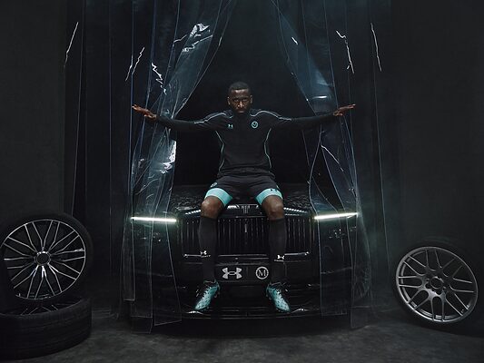 셔츠, 타이, 팬츠, 모두 발렌티노. 모자, 클럽 액티비티. 반지, 마마카사르 at 헤이. 귀고리, 헤이. 구두, 알렉산더 맥퀸.