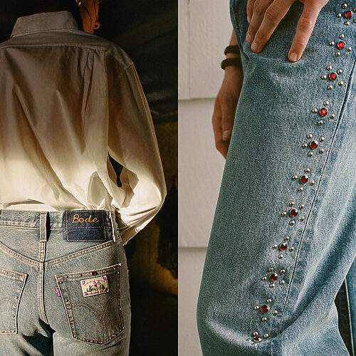 포켓 디테일의 블루 코튼 재킷, 셰브론 패턴 팬츠, 브라운 레더 몽크 슈즈 가격 미정, 모두 프라다.
