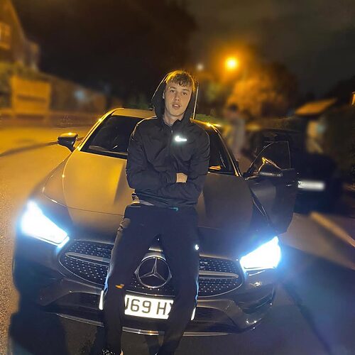 LVERS 다미에 트러커 데님 재킷과 팬츠, 화이트 탱크톱, 카우보이 벨트, 패스포트 핀 캡, LV 블랙 풋 프린트 사커 스니커즈 가격 미정, 모두 루이 비통.