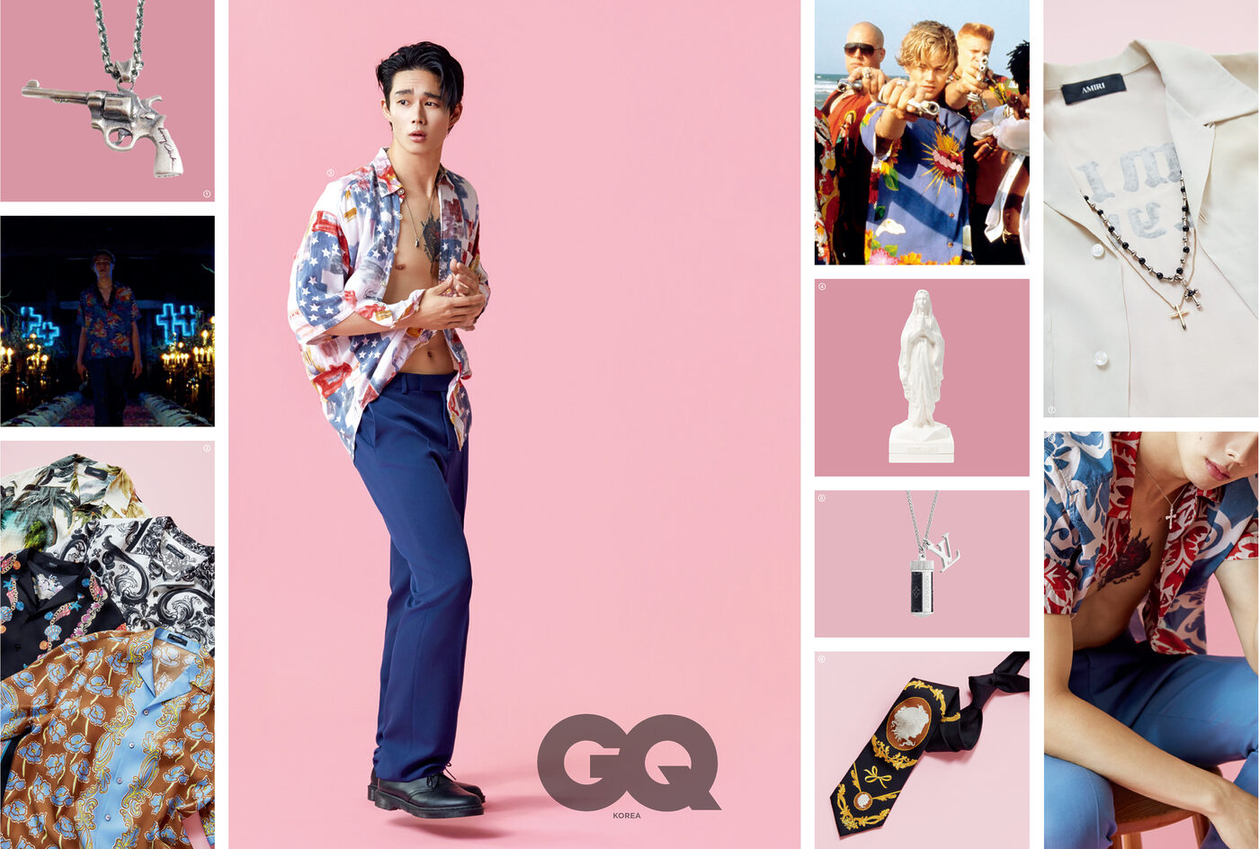 ① 정교한 리볼버 펜던트 네크리스 27만8천원, 불레또. ② 위부터 | 팜트리 패턴 파라다이스 볼링 셔츠 1백60만원대, 아미리. 마욜리카 프린트 실크 트윌 하와이안 셔츠 2백66만원, 돌체앤가바나. 셸 & 엔젤 프린트 블랙 실크 셔츠 가격 미정, 플라워 프린트 코랄 시어터 실크 셔츠 1백77만원, 모두 베르사체. ③ 성조기 모티프의 빈티지 셔츠 9만5천원, 파프제이. 네이비 팬츠 가격 미정, 베르사체. 레이스업 옥스퍼드 슈즈 21만원, 닥터마틴. 태그 펜던트 목걸이 가격 미정, 크롬하츠. ④ 성모 마리아 모형의 인센스 버너 가격 미정, 와코 마리아. ⑤ 작은 물병 모양의 모노그램 이클립스 참 목걸이 79만원, 루이 비통. ⑥ 실크 타이 가격 미정, 베르사체. ⑦ 아이보리 볼링 셔츠 1백60만원대, 아미리. 묵주 모티프 십자가 네크리스 가격 미정, 돌체앤가바나. 스크루 드라이버 펜던트 네크리스 26만원, 넘버링. ⑧ 블루와 레드 조합의 코튼 패턴 셔츠 44만7천원, 틴토리아 마테이 954 at 샌프란시스코 마켓. 스카이 블루 울 팬츠 가격 미정, 베르사체. 크리스털 장식 십자가 네크리스 17만원, 넘버링.