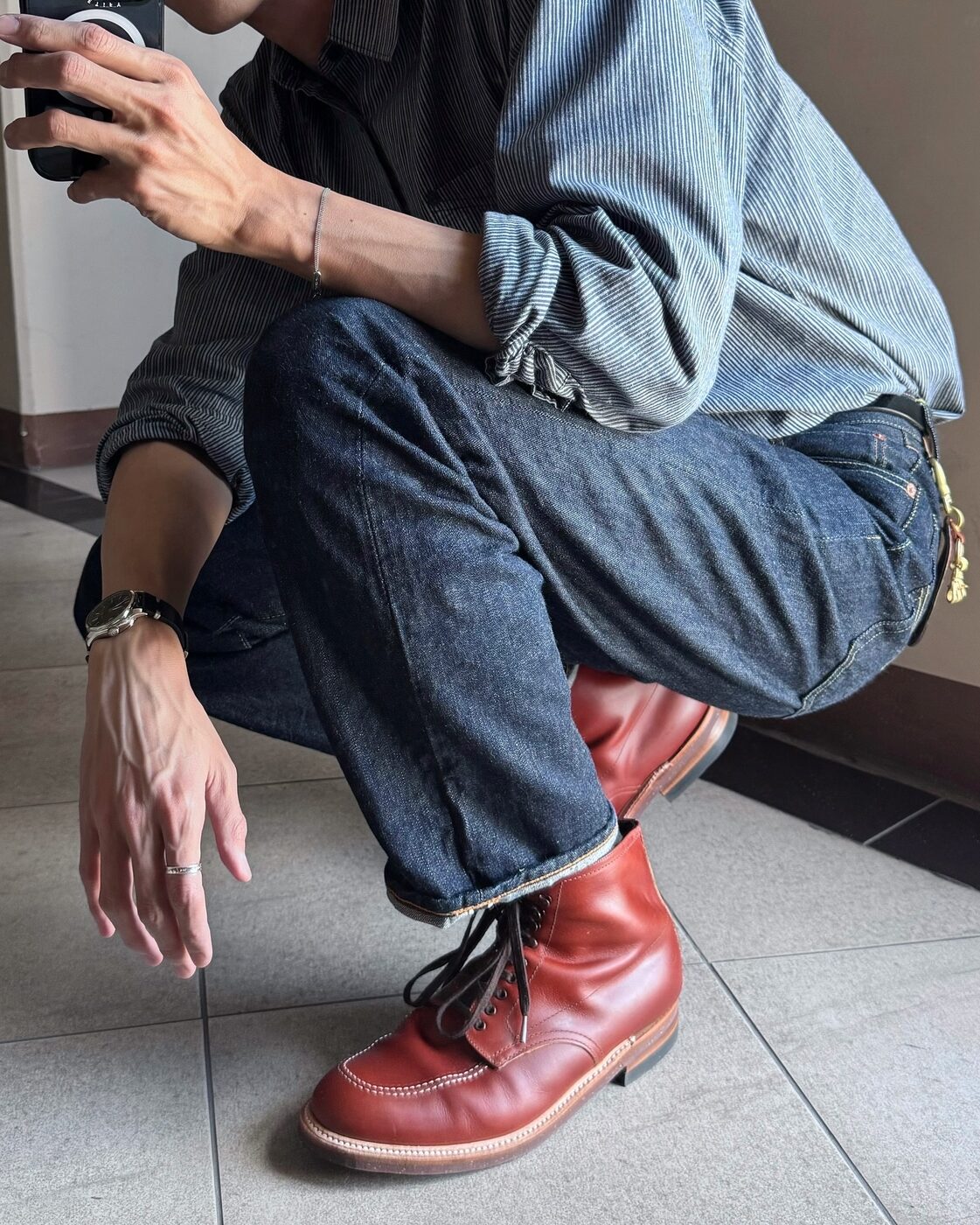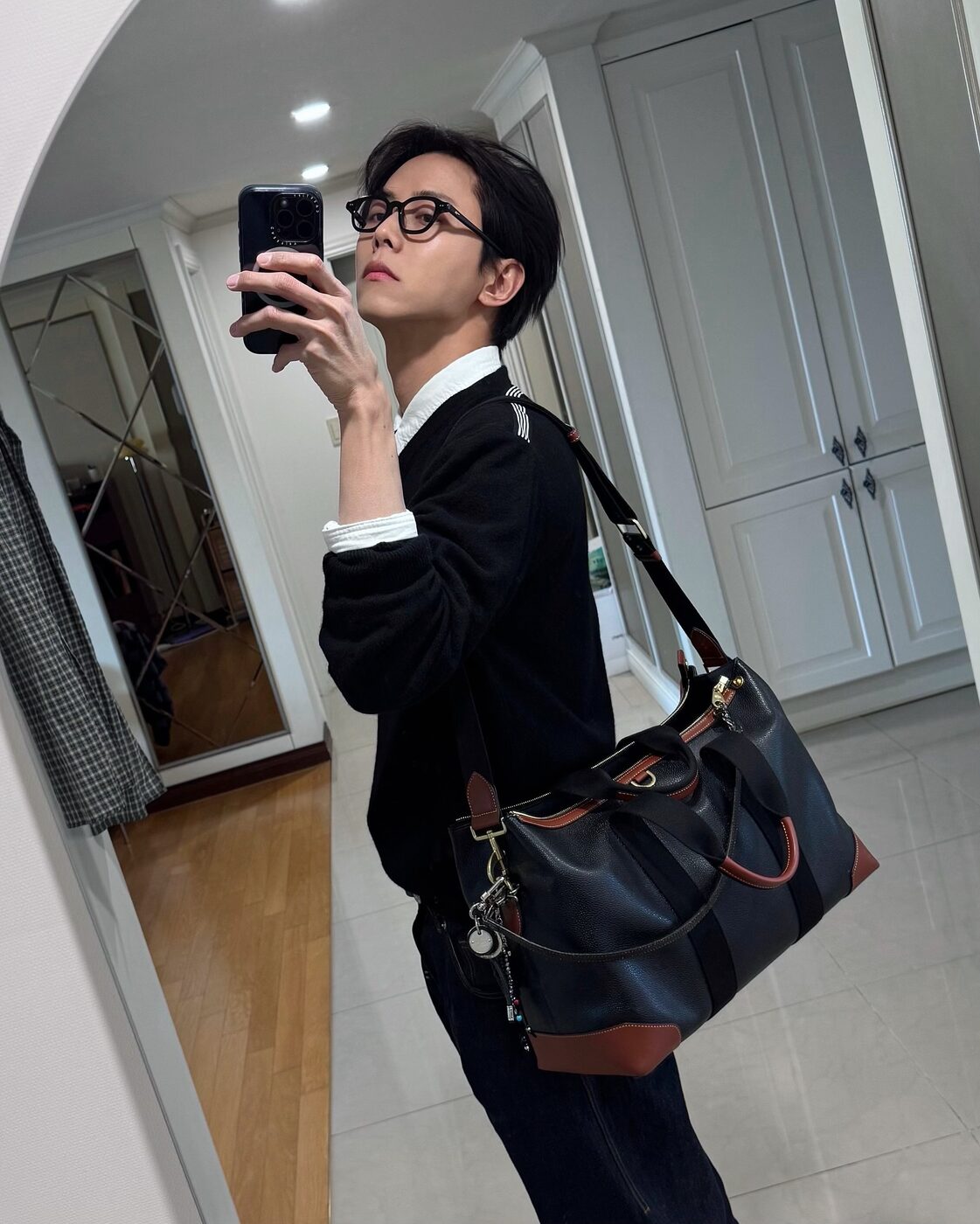 중요한 미팅이나 프레젠테이션이 있는 날이라면 주우재의 단정하고 세련된 스타일을 눈여겨보자. 깔끔한 화이트 셔츠 위에 블랙 니트를 레이어드하고, 클래식한 디자인의 토트백을 더해 안정감과 신뢰감을 주는 조합을 완성했다. 블랙 앤 화이트의 모노톤은 포멀하면서도, 슬림한 안경 프레임이나 구조적인 가방으로 디테일을 살리면 지나치게 보수적이지 않은 모던 비즈니스 룩이 된다. 여기에 캐주얼한 무드를 가미하고 싶다면 생지 데님을 선택할 것. 같은 톤의 셔츠를 단정히 넣어 입고, 포인트 컬러의 워커를 매치하면 센스 있는 뉴비즈니스 룩이 완성된다. @ophen28