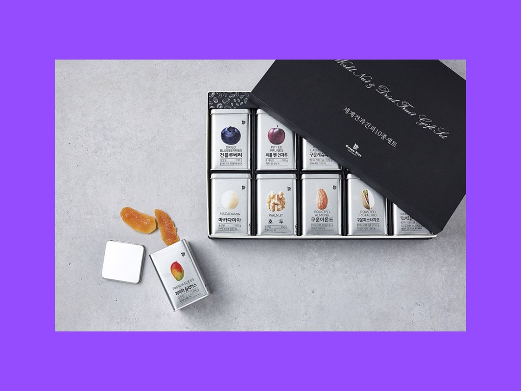 하루 세 끼와 간식에 대해선 전문가 조차도 의견이 다양하지만, 매일 일정량의 견과류를 섭취하는 것이 건강에 좋다는 사실은 모두가 공감하고 인정한다. 다양한 견과류와 베리류를 먹으면 저속 노화와 다이어트, 치매 예방까지 모두 해낼 수 있다. 우리 모두는 이 사실을 알지만, 챙겨 먹으려니 번거로워 달콤한 음료와 쿠키를 먹게 되는 것 뿐이다. 건블루베리, 건파파야, 마카다미아, 호두, 아몬드, 캐슈너트, 피스타치오 등이 고급스러운 틴케이스에 들어 있다. 입이 심심할 때 꺼내어 먹어도 좋고, 샐러드나 요거트 토핑으로 활용해도 좋다. 13만9000원