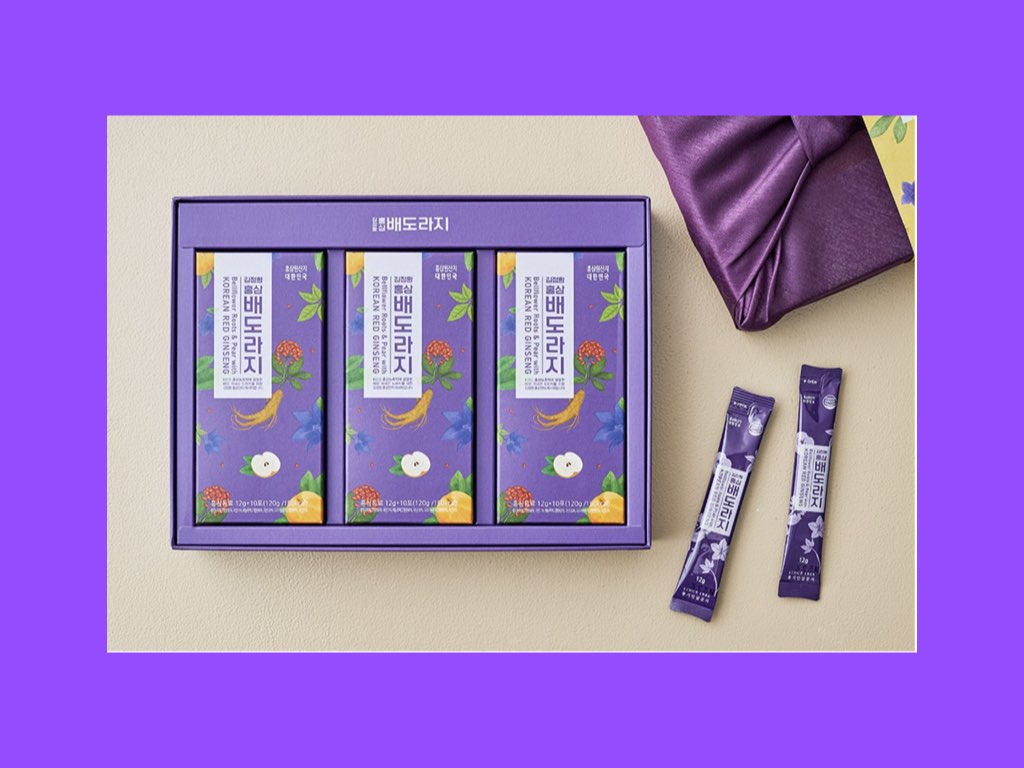 명절 선물로 홍삼이 빠질 수 없다. 여기 환절기 기관지 건강까지 챙길 수 있는 배도라지 홍삼 선물 세트가 있다. 국산 배와 도라지의 단맛과 홍삼 본연의 진한 맛을 개별 포장으로 간편하게 섭취할 수 있다. 여전히 코로나의 기억이 남아있는 우리들에게 기침 감기는 피하고 싶은 일이니까. 미리미리 건강을 지키자. 보랏빛 보자기에 포장되어 명절 선물로 좋다. 역시 마켓컬리 홈페이지에서 60%가 넘는 큰 폭의 할인 중이다. 4만9800원