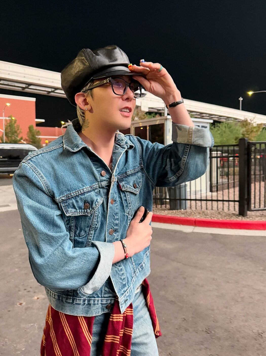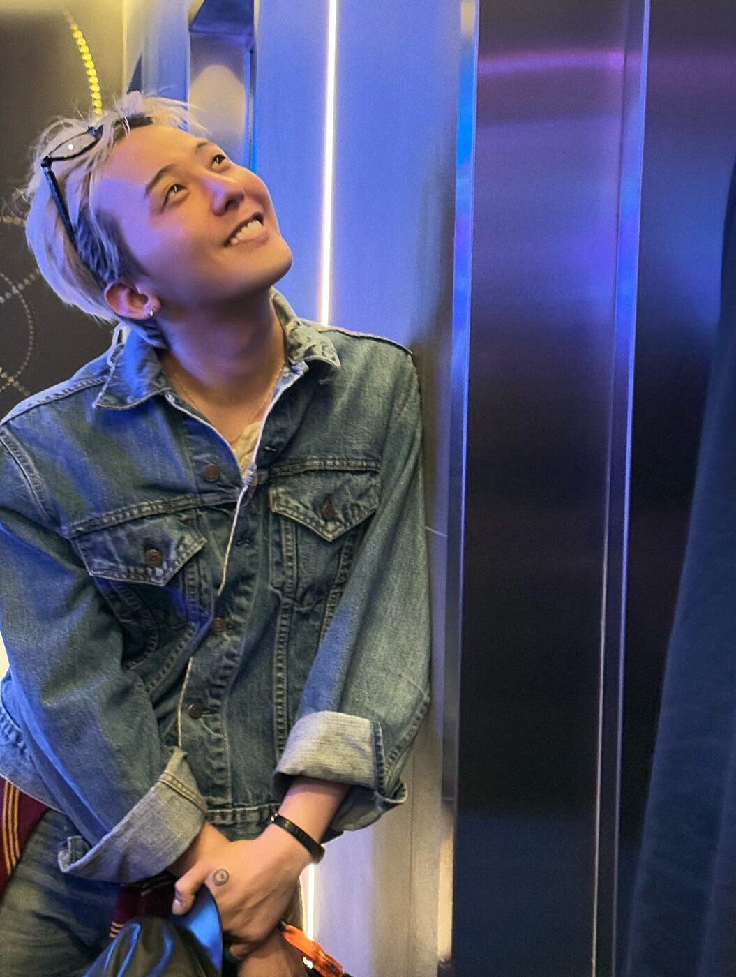 변우석과 반대로 지드래곤은 한층 자유로운 무드를 더했다. 골반 위로 떨어지는 짧은 기장의 중청 데님 재킷에 소매를 걷어 올려 경쾌한 실루엣을 연출했고, 허리에는 레드+오렌지 스트라이프 티셔츠를 둘러 포인트를 줬다. 여기에 모자와 안경을 더해 지드래곤 특유의 키치한 무드를 완성. 청청 룩이 단조로워 보일까 고민된다면, 상반되는 컬러의 아이템을 허리에 묶거나 액세서리로 개성을 더해보는 것이 좋은 팁이다. @8lo8lo8lowme