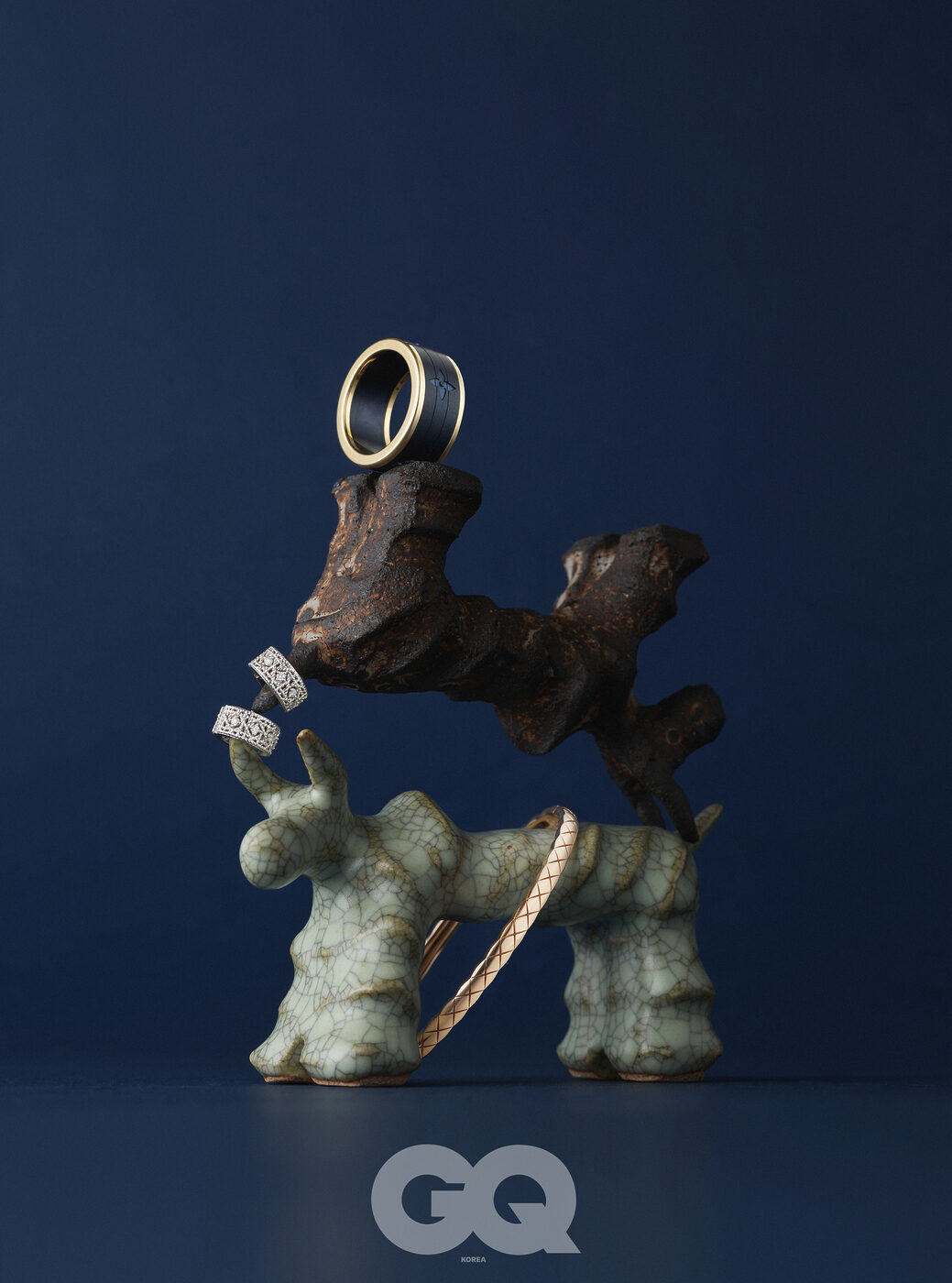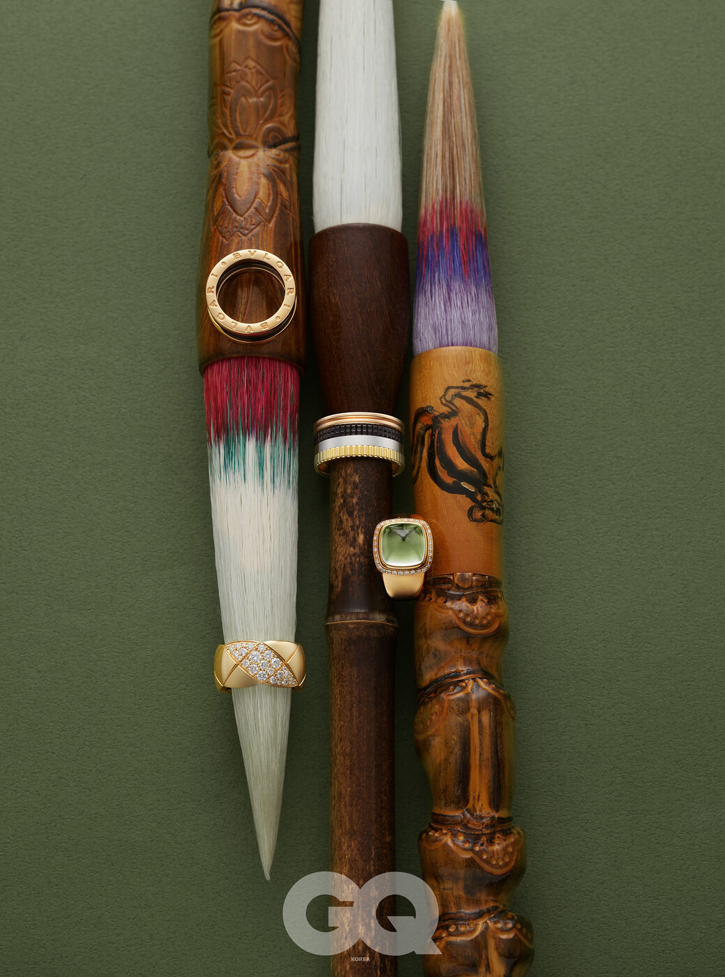 로즈 골드에 블랙 세라믹을 더한 비제로원 링 2백95만원, 불가리. 18K 옐로 골드에 퀼팅 모티프를 따라 다이아몬드를 빼곡히 세팅한 코코 크러쉬 라지 링 가격 미정, 샤넬 파인 주얼리. 18K 옐로 골드, 화이트 골드 및 핑크 골드에 브라운 PVD를 장식한 콰트로 클래식 라지 링 8백만원대, 부쉐론. 프레지오라이트 카보숑과 다이아몬드로 이루어진 핑크 골드 빵 드 쉬크르 링 1천2백43만원, 프레드.
