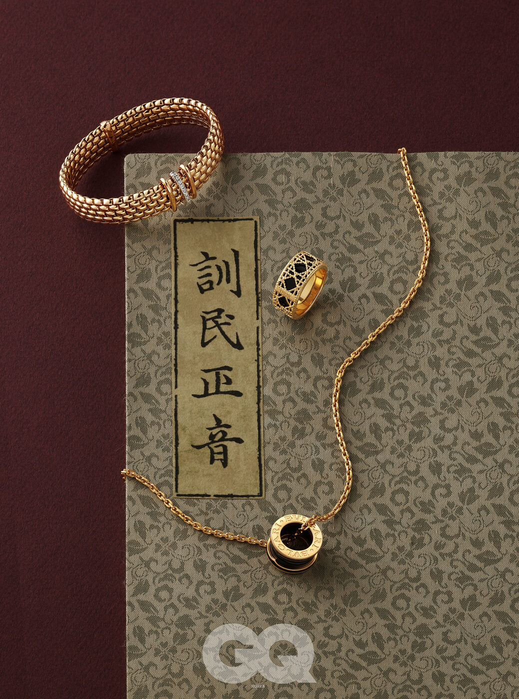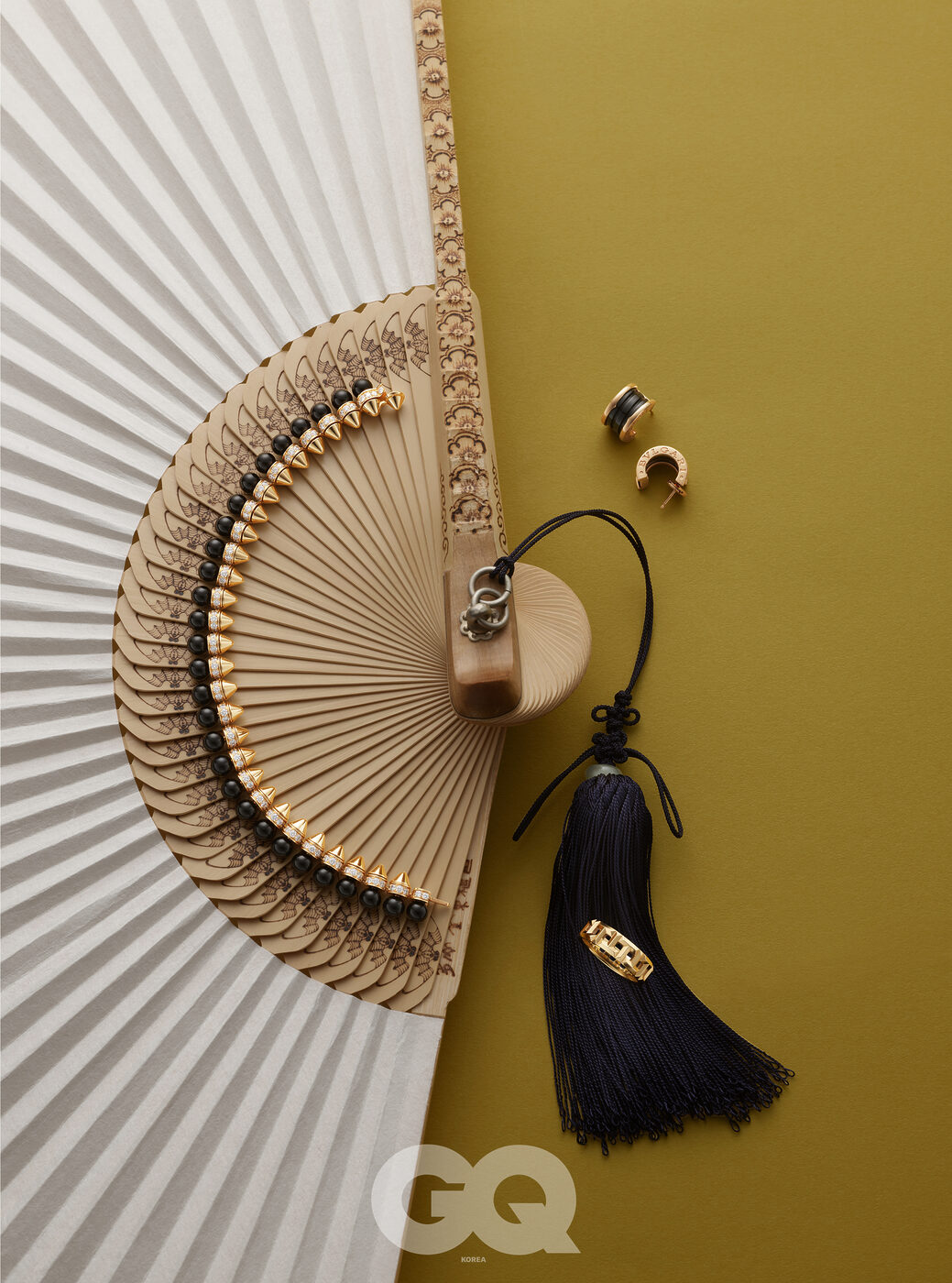 18K 로즈 골드에 화이트 다이아몬드를 세팅한 플렉스잇 브레이슬릿 가격 미정, 포페. 블랙 래커와 옐로 골드의 대비가 돋보이는 까나쥬 패턴 마이 디올 링 가격 미정, 디올 파인 주얼리. 로즈 골드와 블랙 세라믹으로 이루어진 비제로원 펜던트 네크리스 8백40만원, 불가리.