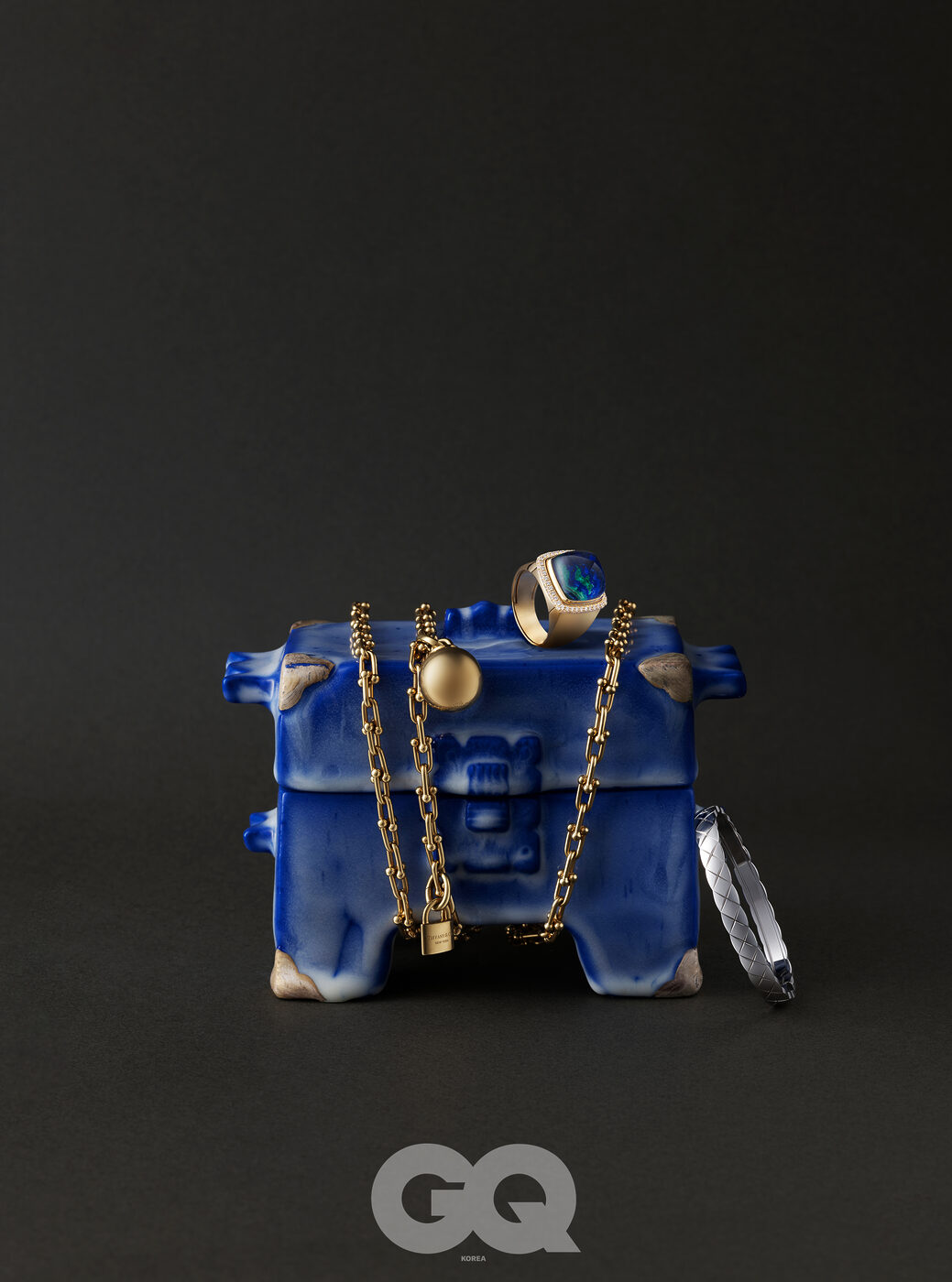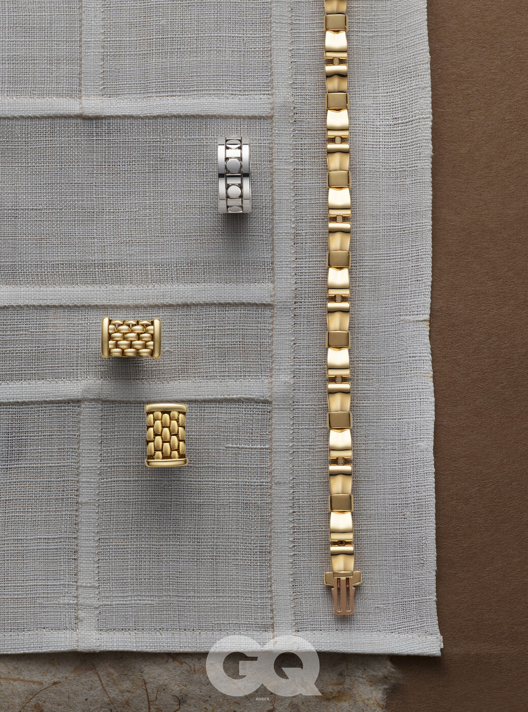 옐로 골드에 블루 티타늄을 장식한 레 가스통 비통 퍼즐 링 가격 미정, 루이 비통 파인 주얼리. 하우스를 상징하는 까나쥬 패턴 중앙에 다이아몬드로 포인트를 준 화이트 골드 마이 디올 이어커프 가격 미정, 디올 파인 주얼리. 퀼팅 모티프를 정교하게 각인한 18K 베이지 골드 코코 크러쉬 미니 브레이슬릿 가격 미정, 샤넬 파인 주얼리.