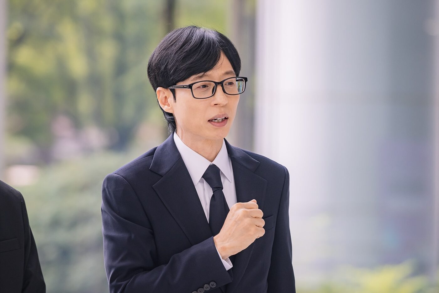 늘 깔끔한 수트 핏으로 유명한 유재석의 정장 룩은 남성 하객룩의 교과서라 불릴 만하다. 군더더기 없는 다크 네이비나 차콜 그레이 수트에 패턴 없는 셔츠와 타이를 매치해 점잖고 실패 없는 인상을 주기 때문. 가족이나 친지 결혼식처럼 격식이 중요한 자리라면 이런 포멀한 스타일이 가장 안전하다. 이때 셔츠는 새하얀 화이트, 슈즈는 광택감 있는 블랙 더비 슈즈로 마무리하면 완벽하다. @hangout_with_yoo