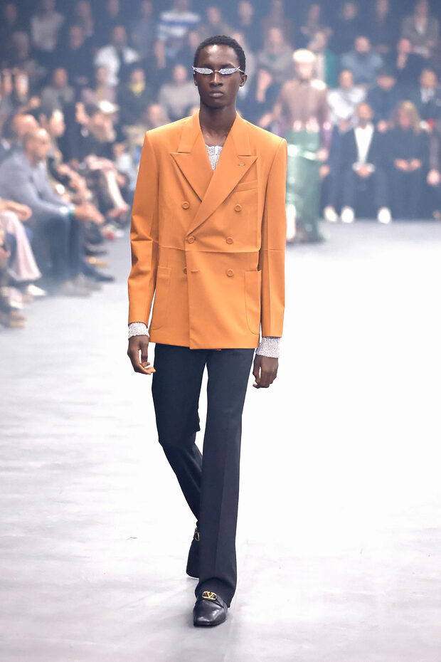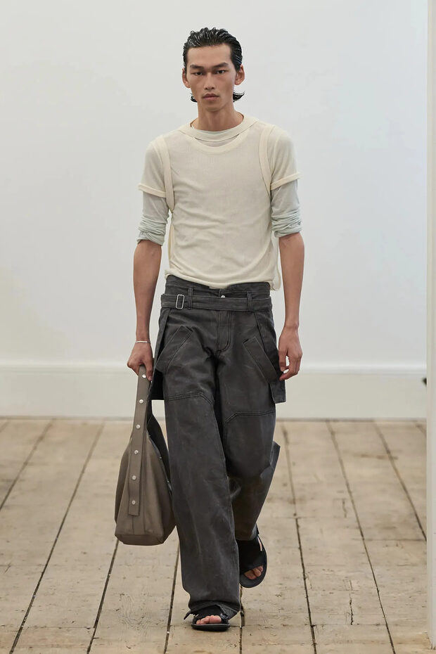 지금 남성복은 ‘벌크업’ 단계에 있다. 실루엣을 강조하기엔 거대한 어깨만큼 확실한 수단이 없다. 보테가 베네타의 루이즈 트로터 데뷔 컬렉션에서 이런 과장된 어깨가 돋보였다. 이건 리크 오웬스식의 날카로운 어깨도, 이탈리아식의 클래식한 구조도 아니다. 오히려 80년대 월가 범죄자의 재킷처럼, 느슨하고 넓으며, 약간 ‘아르마니풍’이다. 과시적이고 거친, 그러나 점점 힘을 얻고 있는 스타일이다.