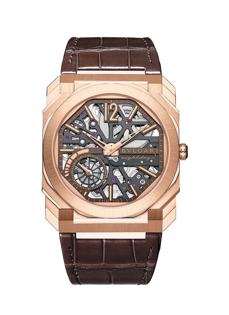 OCTO FINISSIMO 8 DAYS 2022 섬세한 오픈워크 다이얼과 8일간의 파워 리저브를 5.95밀리미터 두께의 로즈 골드 케이스에 담아냈다. 옥토 피니씨모가 단지 얇기만 한 것이 아니라, 예술적 감각을 더한 미학적 타임피스임을 증명하는 모델이다.