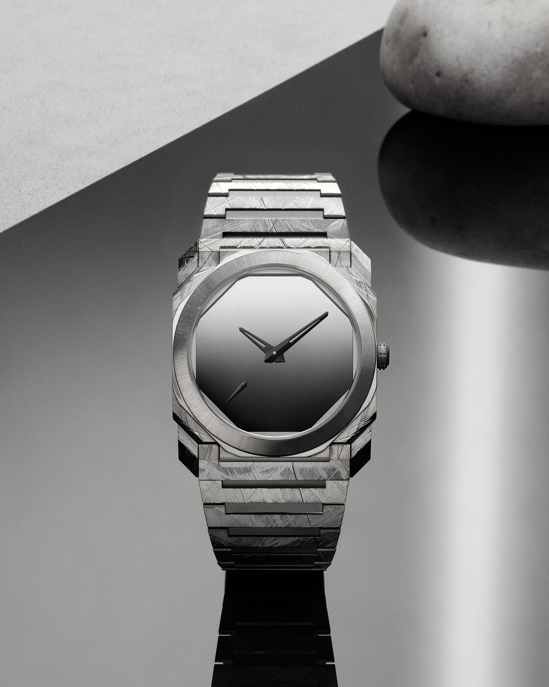 불가리는 건축적이면서도 기하학적인 옥토 피니씨모의 디자인을 캔버스 삼아, 예술가와 건축가들의 시선으로 재창조하는 프로젝트를 지속적으로 진행해왔다. 2020년 안도 타다오는 블랙 세리믹 소재에 투명한 케이스 백을 더했고, 2024년 로랑 그랑소는 스크린 프린팅 기법으로 메탈릭 안료를 여러 겹 쌓아 올린 미묘한 시각 효과를 보여주는 작품을 선보였다. 이번 제네바 워치 데이즈를 통해 불가리는 앞으로 주목해야 할 두 개의 워치를 새롭게 공개했는데, 첫 번째는 프로젝트의 일환으로 한국의 아티스트 이우환과 협업한 옥토 피니씨모 이우환 × 불가리다. 이우환은 일본과 파리에서 자라 세계를 무대로 활동하고 있는 화가이자 조각가, 시인, 철학가로 인간과 자연, 우주의 관계를 탐구하고 시공간의 개념을 표현하는 작가다. 그는 옥토 피니씨모를 무한함을 담은 캔버스로 삼고, ‘고정적이고 유한한 바위’, ‘거울의 무한한 반사’라는 주제를 바탕으로 얇고 작은 캔버스 안에 자신의 세계를 투영했다. 거울처럼 반사되는 다이얼은 미니멀한 블랙 핸즈와 섬세한 조화를 이루고, 작고 단순한 다이얼은 리플렉티브 효과를 통해 무한한 공간으로 확장되었다. 반대로 브레이슬릿은 독특한 표면 처리 기법을 통해 거칠고 투박한 질감으로 표현, 영롱한 다이얼과 극적인 대비를 이뤄 정교한 긴장감이 느껴지는 작품으로 완성했다. 2.23밀리미터 두께의 울트라 씬 BVL 138 칼리버와 마이크로 로터를 탑재했고, 투명 케이스 백에 이우환 작가가 직접 손으로 시그니처를 새긴 타임피스는 오직 150개 한정으로 제작했다.