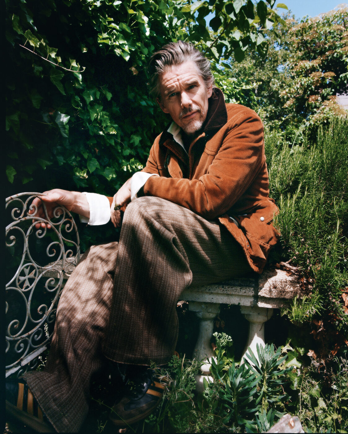 그는 닳은 블루 코듀로이 수트에 노란 줄무늬가 새겨진 스니커즈를 신은 채 나타났다. 카페의 누군가가 혹여 에단 호크를 알아봤다 하더라도 티를 내지는 않았다. 손님들 사이에 끼어 앉아 어깨조차 펼 공간이 없는 테이블에 느긋하게 몸을 기댄 그는 아널드 파머와 루콜라 샐러드를 주문하고는 부스러기들을 손으로 집어먹었다.