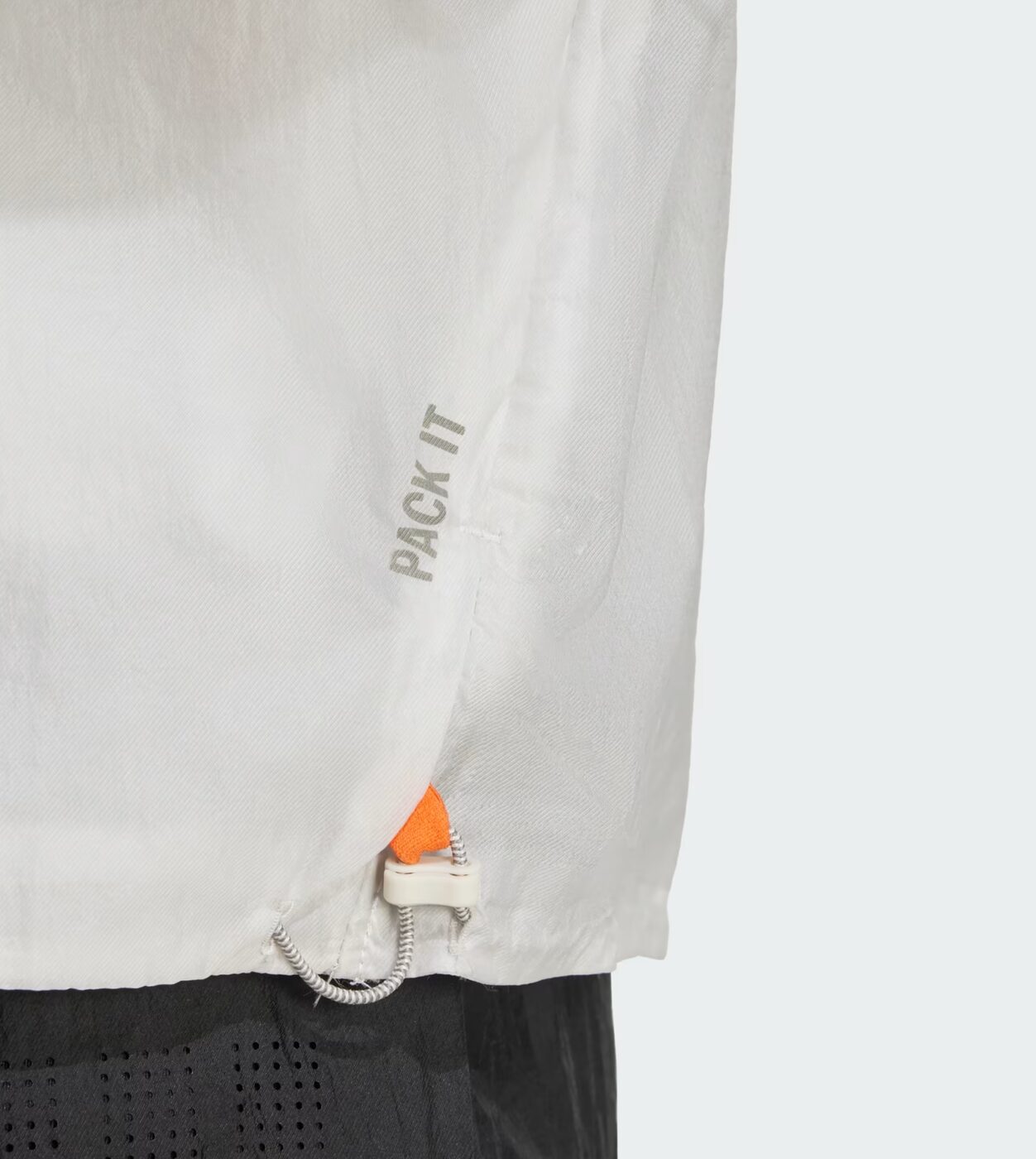 안이 비칠 정도로 가벼운 소재. 움직일 때마다 바스락거리는 느낌이 고급스럽다. 이렇게 얇은데 방수가 된다고? 심지어 옷 전체에 테이핑 처리가 되어 있어 빗물이 침투할 틈이 없다. 색상도 예쁘지만 옷을 후드 뒷부분의 메시 파우치에 접어서 넣으면 한 손에 쏙 들어올 정도로 작은 크기가 된다.