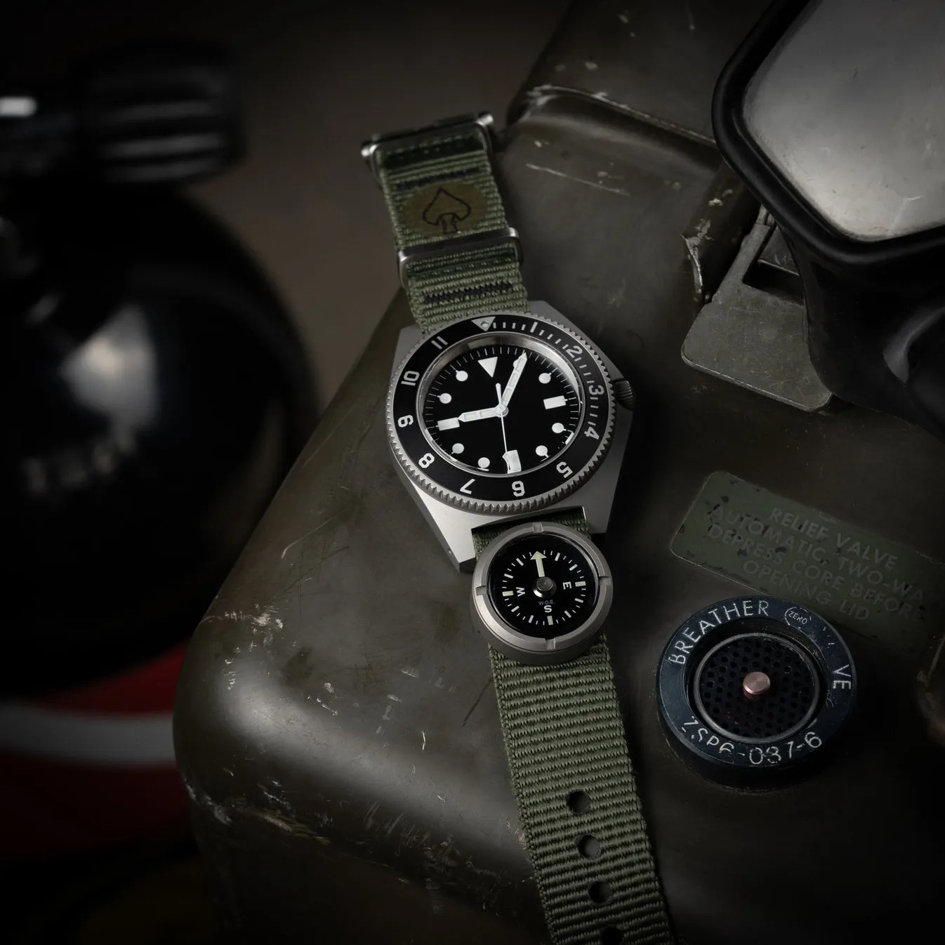 최근 에스피오나지는 시계 스트랩에 부착할 수 있는 “서브머서블 손목 컴파스” 즉, 손목 나침반을 선보였다. 이걸 NATO 스트랩이나 러버 브레이슬릿과 함께 매치하면, 정말 거칠고 밀리터리스러운 느낌의 장비처럼 연출된다.