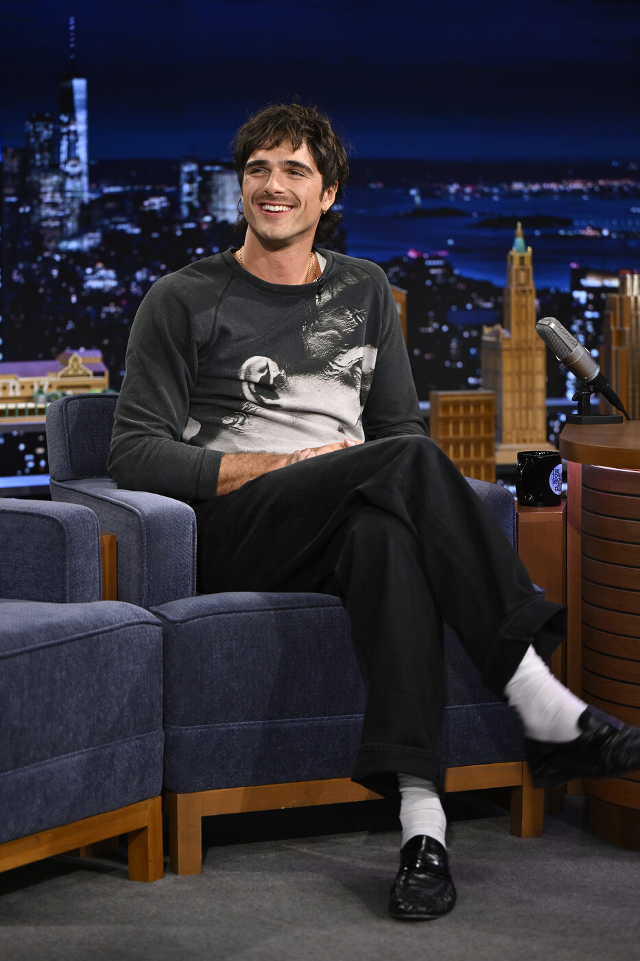크리스토퍼 케인 몬스터 프린트 스웨터를 입고 지미 팰런의 투나잇 쇼에 출연한 제이콥 엘로디