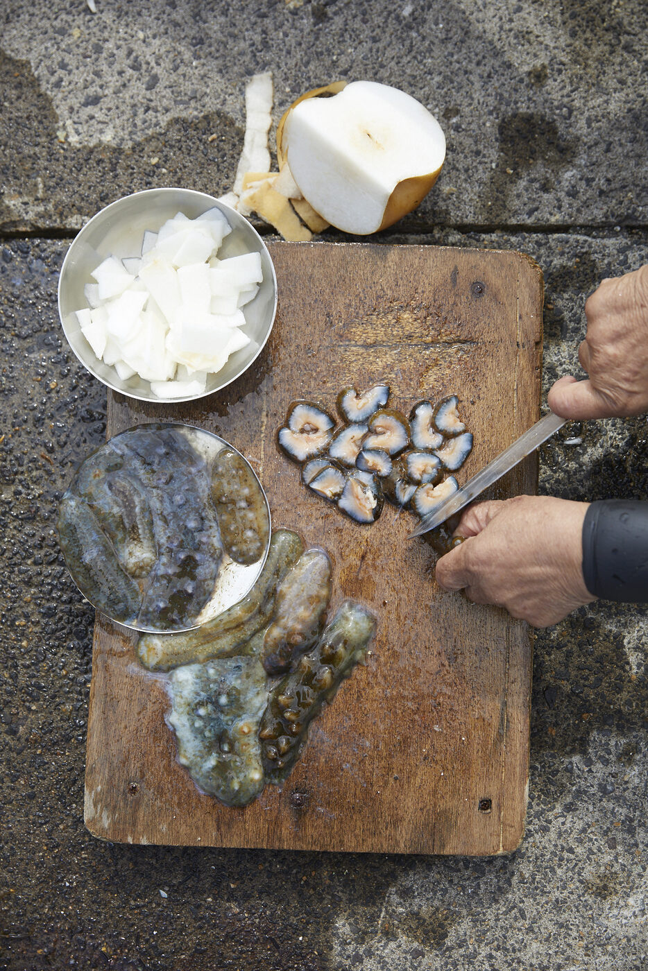 “물질하는 날 해삼 잡히면 같이 사는 아들 몸보신 시켜준다고 가지고 와서 해삼 토렴 만들어줘. 영 배를 네모지곡 알상하게 썰엉 농곡 해삼 잡은 것도 얇게 썰엉 촘지름 넣곡 깨소금 넣엉 저서 먹으믄 맛 잘도 좋아.” – 제주 김영희 님 입말.