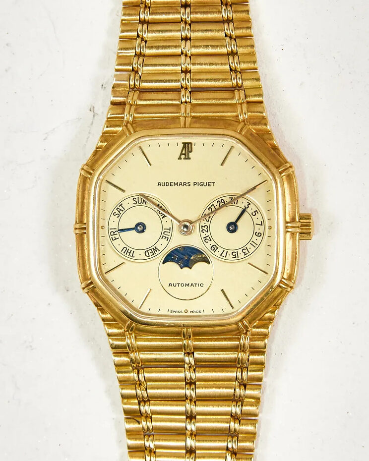 보통 오래된 오데마 피게를 구입한다면 빈티지 로얄오크를 고르는 게 일반적이지만, 엘로디는 훨씬 멋진 선택을 했다. 이날 그의 손목에 빛나던 것은 황금 소재의 오토매틱 데이-데이트-문페이즈 시계로, 대나무 같은 베젤과 일치하는 브레이슬릿이 특징이다. 슬림하고 우아한 분위기를 풍기는 이 시계는 제럴드 젠타의 매력과 오데마 피게 특유의 복잡한 시계 제작 접근 방식을 결합해, 오늘날 컬렉터들이 열광하는 바로 그 종류의 시계다. 이 시계들은 종종 5만 달러대 후반, 7~8천만 원에 거래된다.