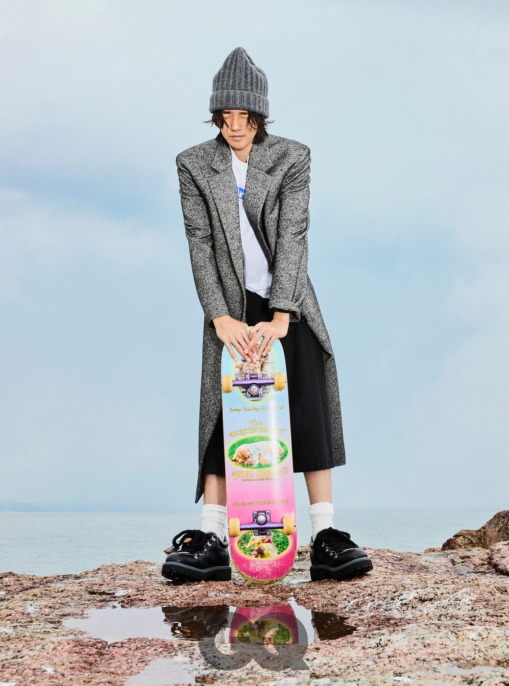 디컨스트럭티드 프레스코 오버 코트 7백81만원, 구스 자수 쇼츠 가격 미정, 모두 톰 브라운. 그레이 후디 가격 미정, 나이키. LV 버터소프트 스니커즈 가격 미정, 루이 비통. 시어링 칼라 울 코트 1천1백70만원, 체크 셔츠 2백69만원, 모두 프라다. 화이트 티셔츠 가격 미정, 꾸레쥬. 가먼트 다이드 데님 팬츠 1백9만원, 르메르. 올드스쿨 스니커즈 가격 미정, 꼼데가르송.