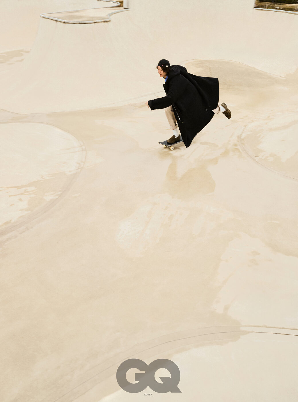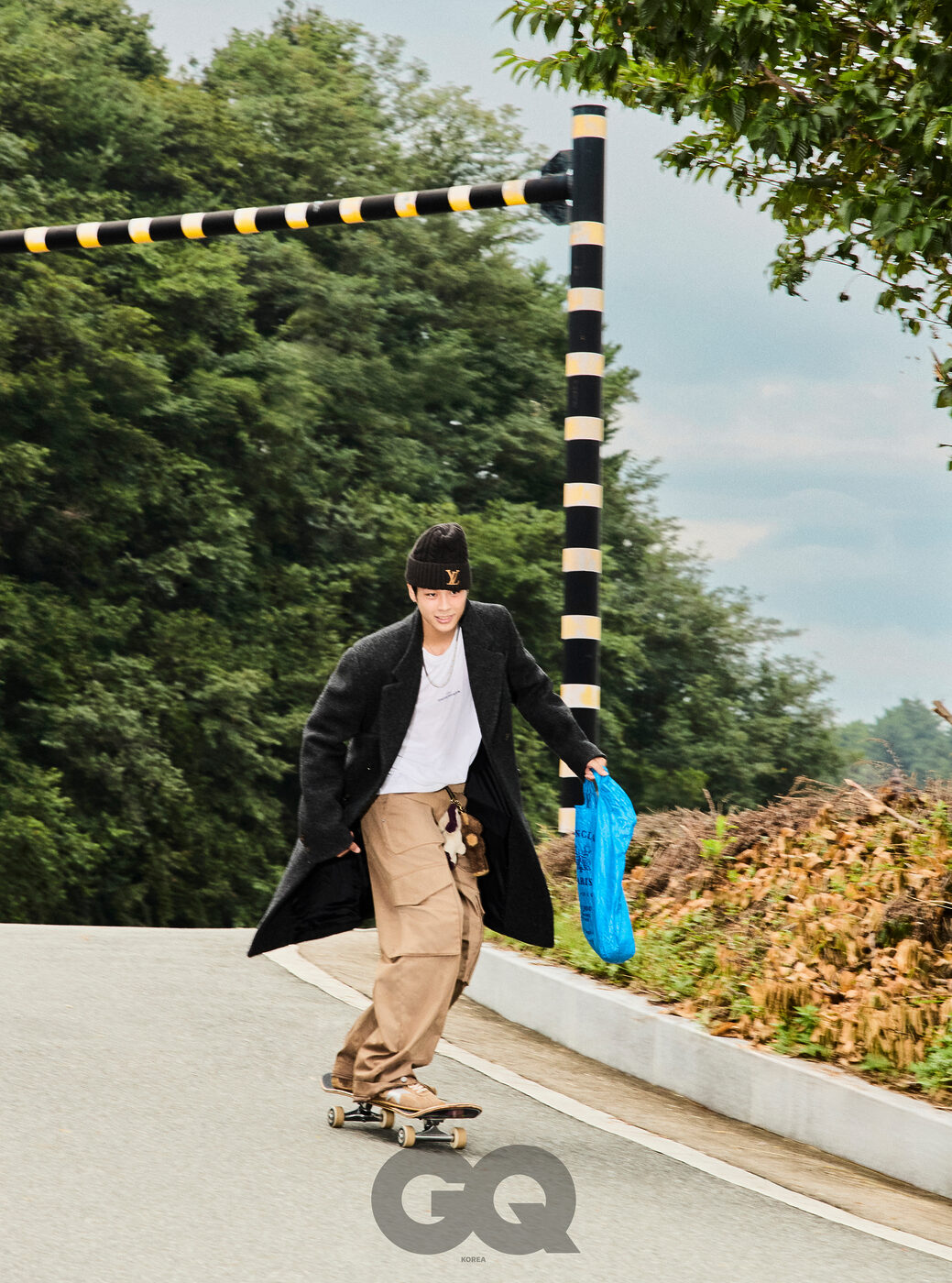 그레이 울 코트 4백90만원, 로에베. 화이트 티셔츠 가격 미정, 리바이스. 블랙 버뮤다 팬츠 가격 미정, 준지. LV 리믹스 더비 슈즈 가격 미정, 루이 비통. 펠티드 울 비니 71만원, 메종 마르지엘라.
