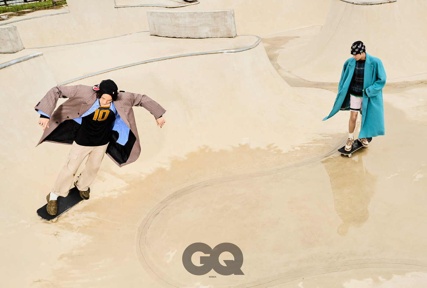 브라운 스트라이프 코트 가격 미정, 렉토. 포플린 블루 셔츠 12만9천원, 아르켓. 프린트 코튼 톱 가격 미정, 메종 마르지엘라. 코튼 카고 팬츠 2백5만원, 루이 비통. 메시 로퍼 23만9천원, 뉴발란스. 볼 캡 가격 미정, 디젤. 블루 울 코트 2백37만원대, 겐조. 모헤어 체크 니트 톱 가격 미정, 사카이. 핑크 쇼츠, 에어포스 슈즈 가격 미정, 모두 나이키. 샤인 비니 12만8천원, 어티슈.