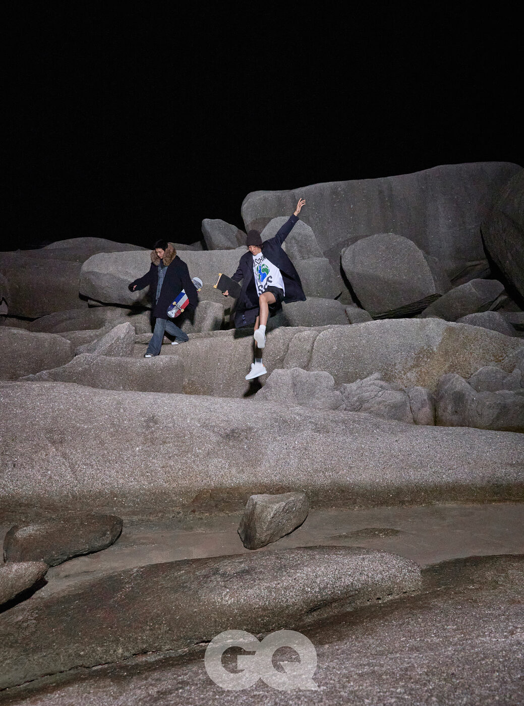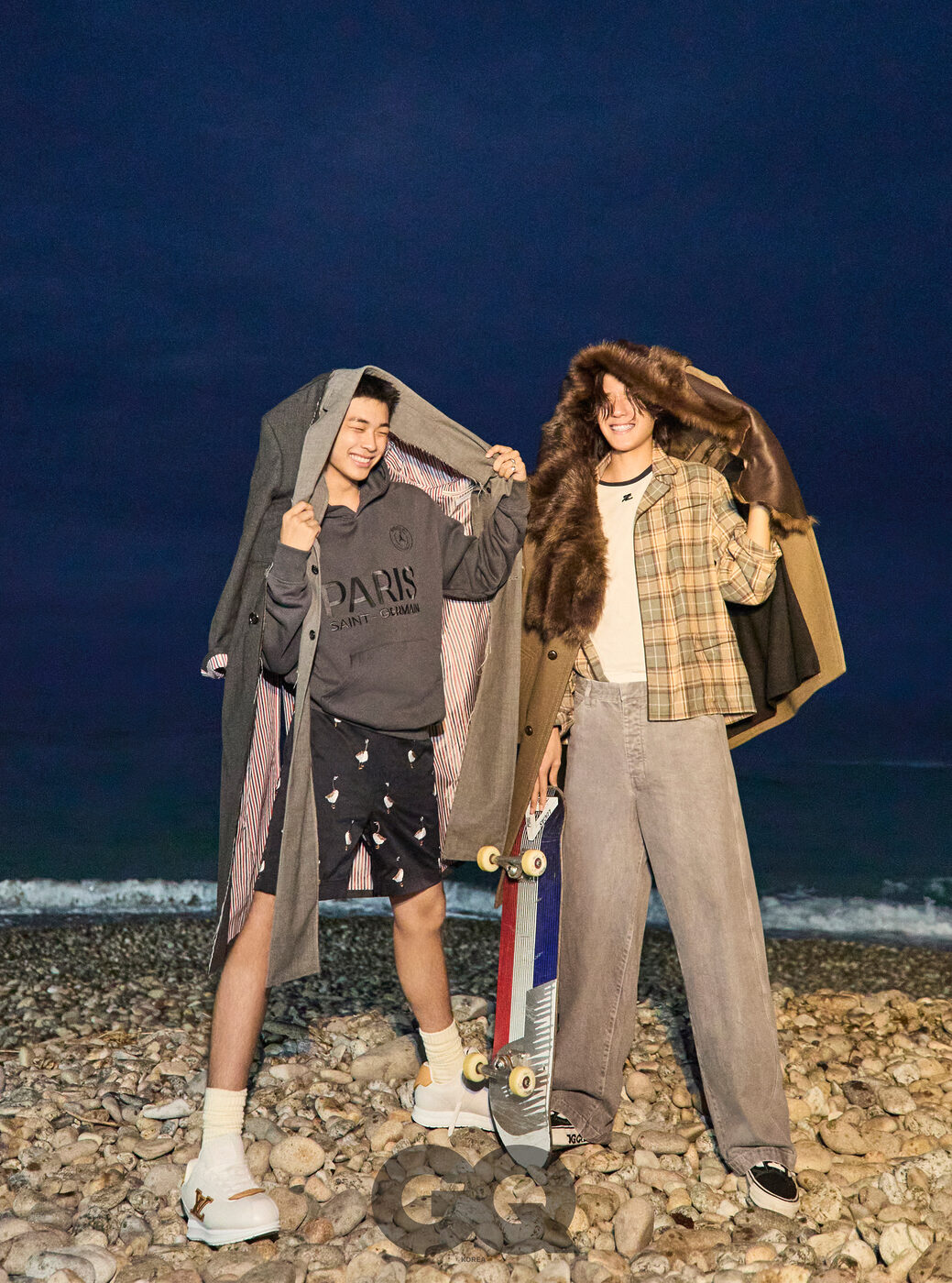 네이비 코트 5백40만원, 퍼 후드 데님 재킷 4백90만원, 그레이 티셔츠 가격 미정, 로 크로치 팬츠 2백19만원, 모두 발렌시아가. 브이 로고 로톱 스니커즈 62만원, 발렌티노 가라바니. 블랙 코트 가격 미정, 블랙 쇼츠 1백49만원, 모두 메종 마르지엘라. 오버사이즈 티셔츠 가격 미정, 모스키노. LV 버터소프트 스니커즈, 브라운 비니 가격 미정, 모두 루이 비통.